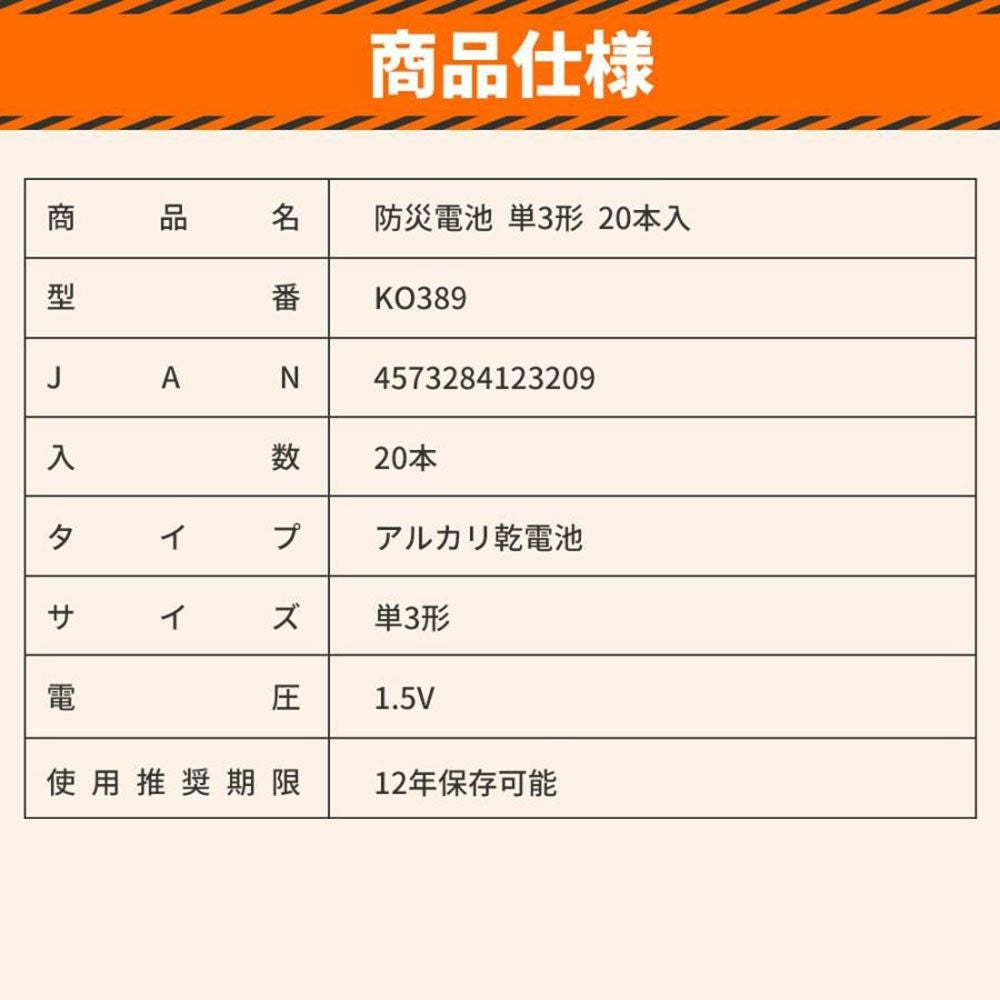 他の画像を見る 停電、緊急時の強い味方 長期保存可能な防災用乾電池 アルカリ乾電池 防災電池 単3形 20本入 10個セット 12年保存 乾電池 単3電池 防災士監修 長期保存 防災グッズ KO389 公式サイト特別価格 ¥ 8,046 税込 詳細を見る お気に入りに登録する