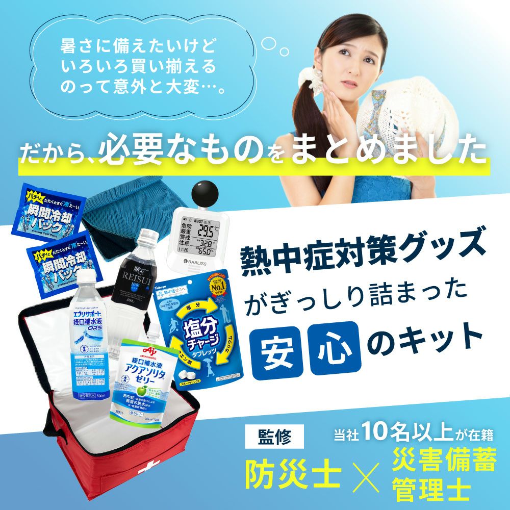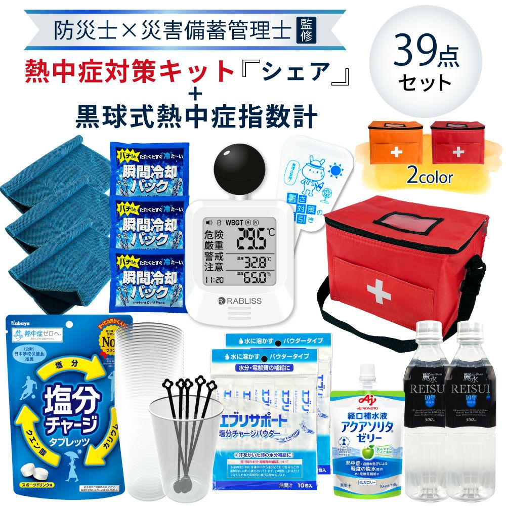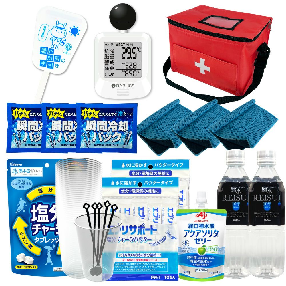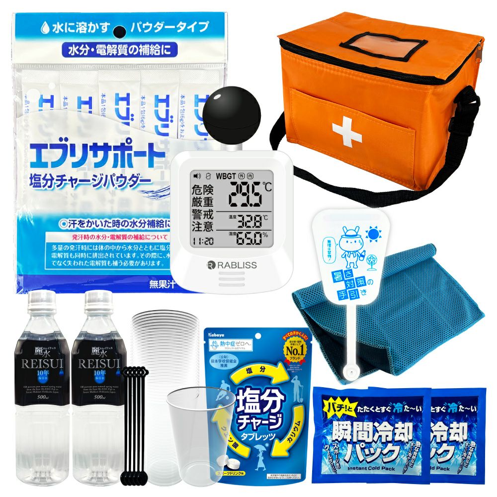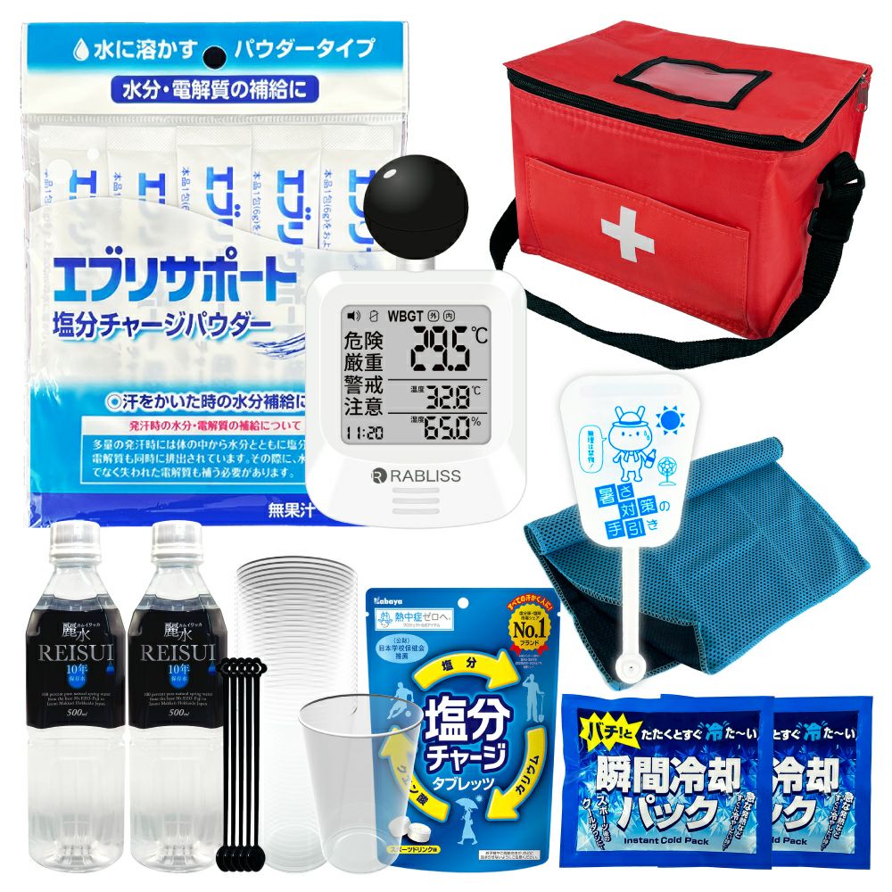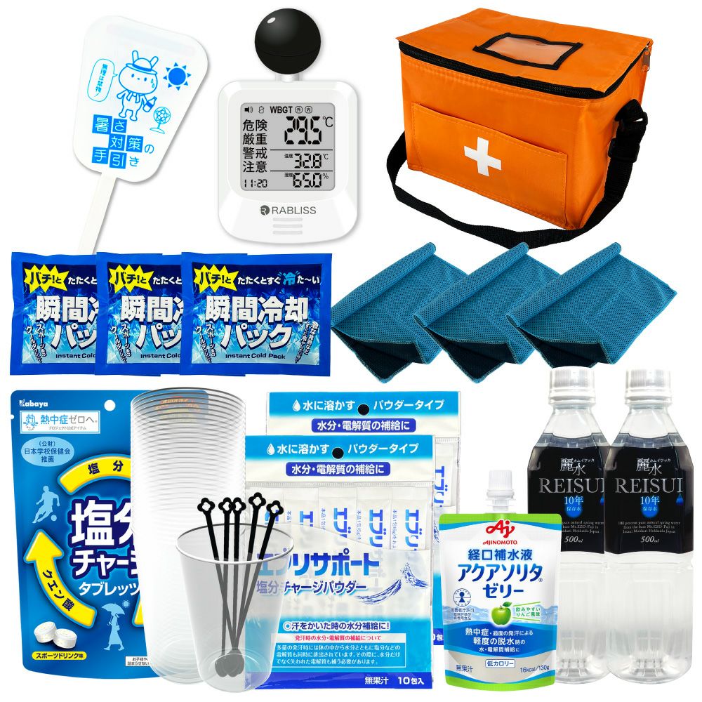 他の画像を見る 防災士監修 みんなで使える シェア用 熱中症対策セット 暑さ対策 熱中症予防キット 夏場の現場作業 工場 スポーツ アウトドア 塩分補給 車載用にも 熱中症対策用品 熱中症対策キット シェア 黒球式熱中症指数計付き 39点 1セット 複数人向け 塩分補給パウダー 熱中症対策グッズ 暑さ対策 WBGT 工事現場 野外作業 アウトドア ATD001K PEACEUP 公式サイト特別価格 ¥ 8,540 税込 詳細を見る お気に入りに登録する