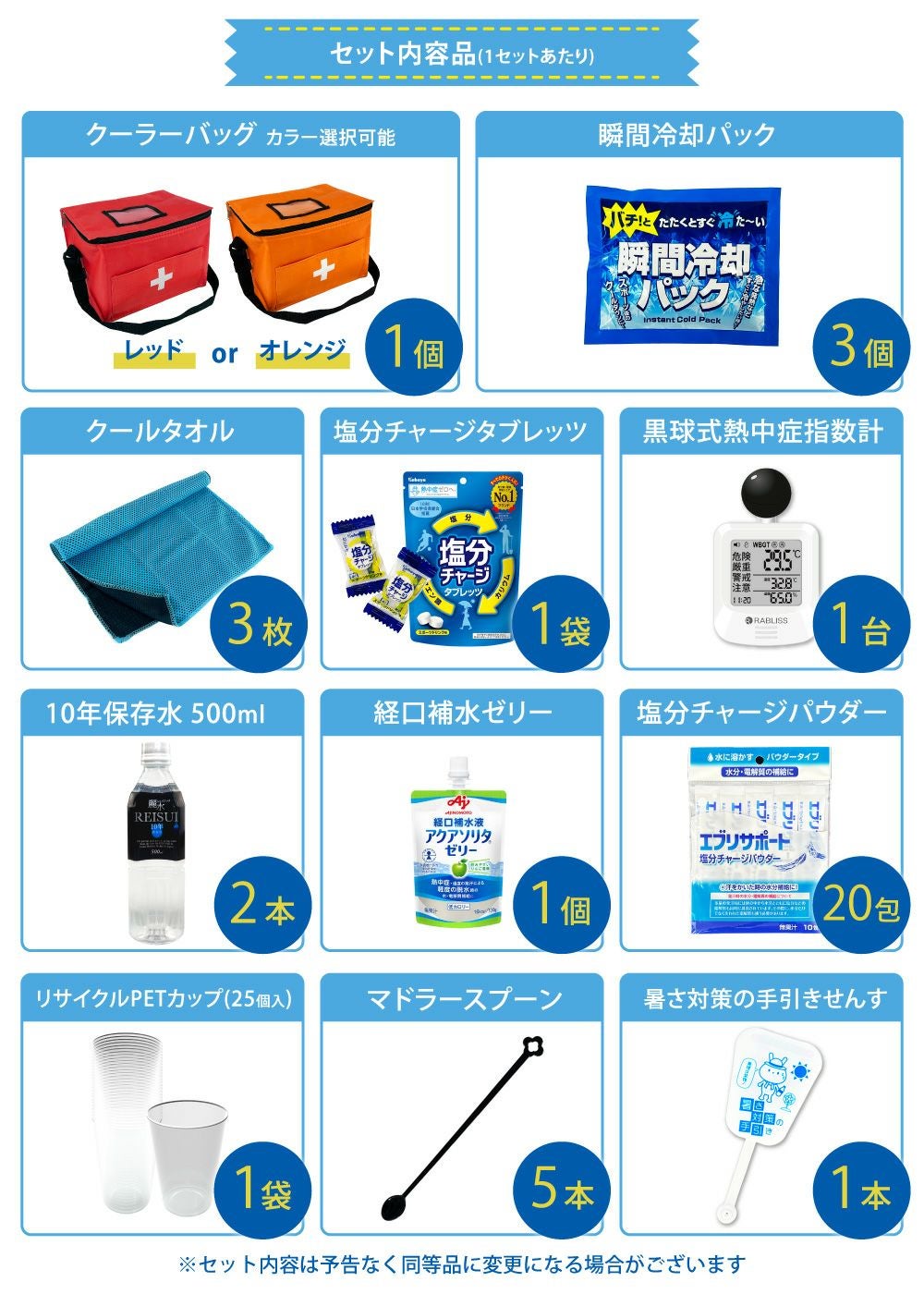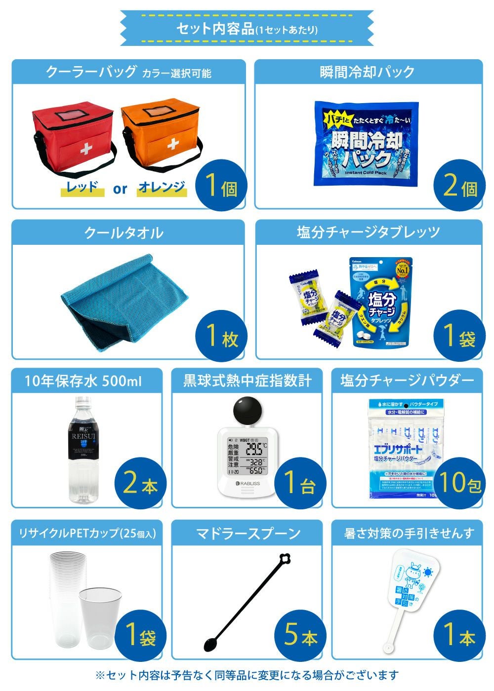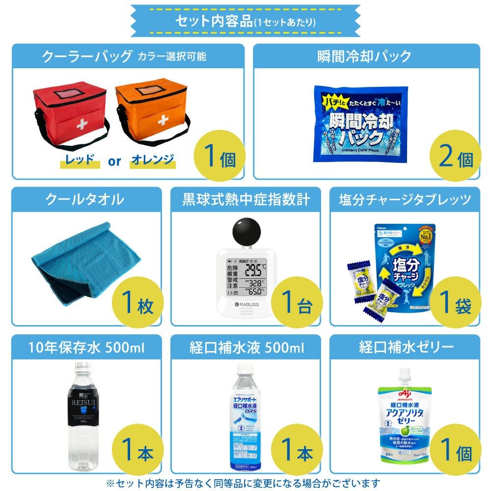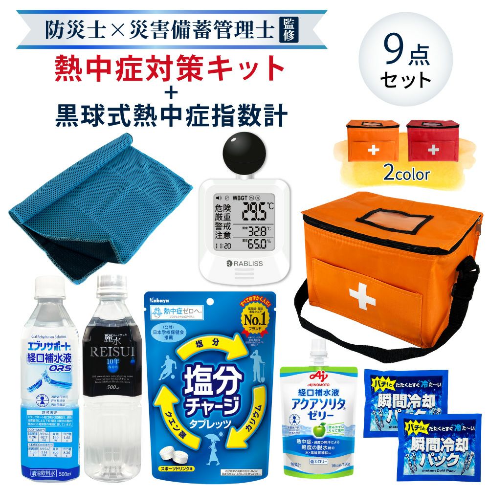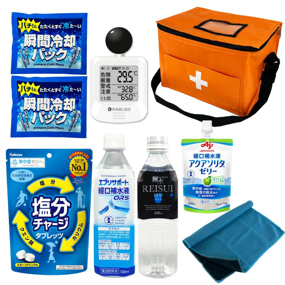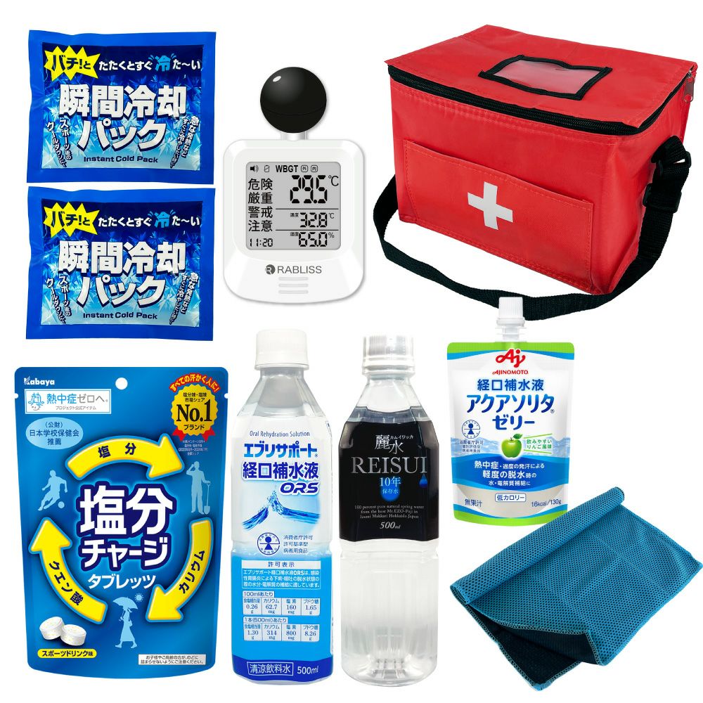 他の画像を見る 防災士監修 みんなで使える シェア用 熱中症対策セット 暑さ対策 熱中症予防キット 夏場の現場作業 工場 スポーツ アウトドア 塩分補給 車載用にも 熱中症対策用品 熱中症対策キット シェア 黒球式熱中症指数計付き 39点 1セット 複数人向け 塩分補給パウダー 熱中症対策グッズ 暑さ対策 WBGT 工事現場 野外作業 アウトドア ATD001K PEACEUP 公式サイト特別価格 ¥ 8,540 税込 詳細を見る お気に入りに登録する