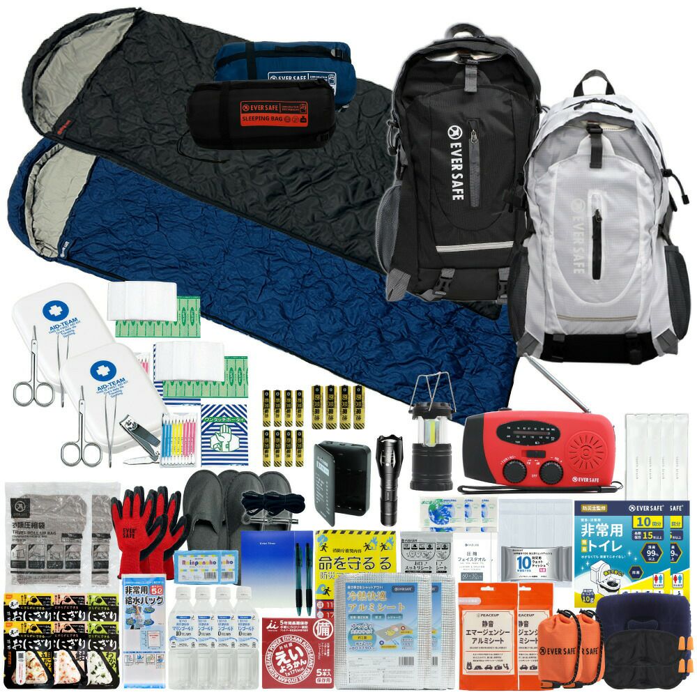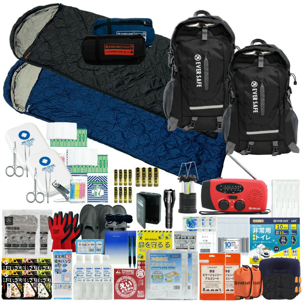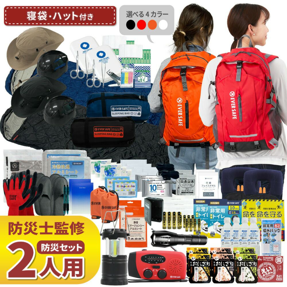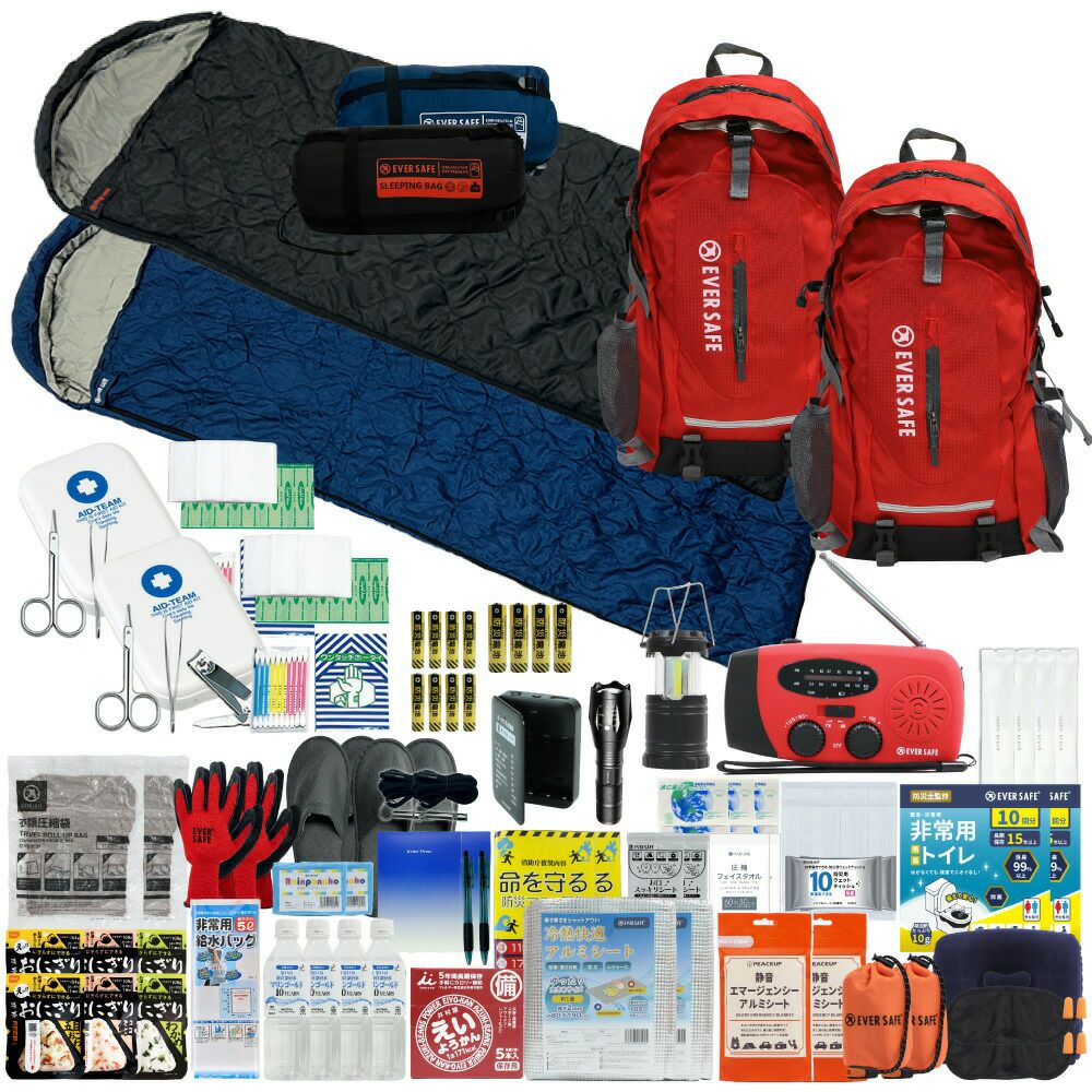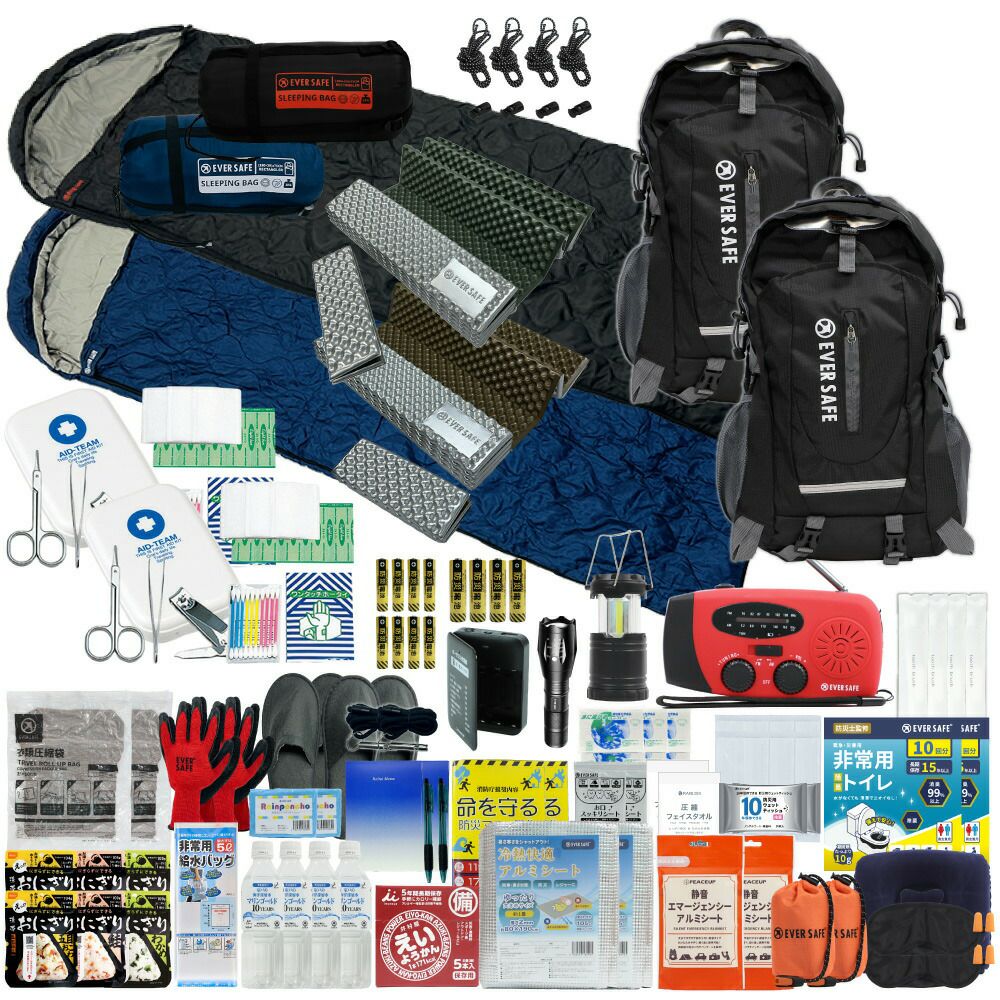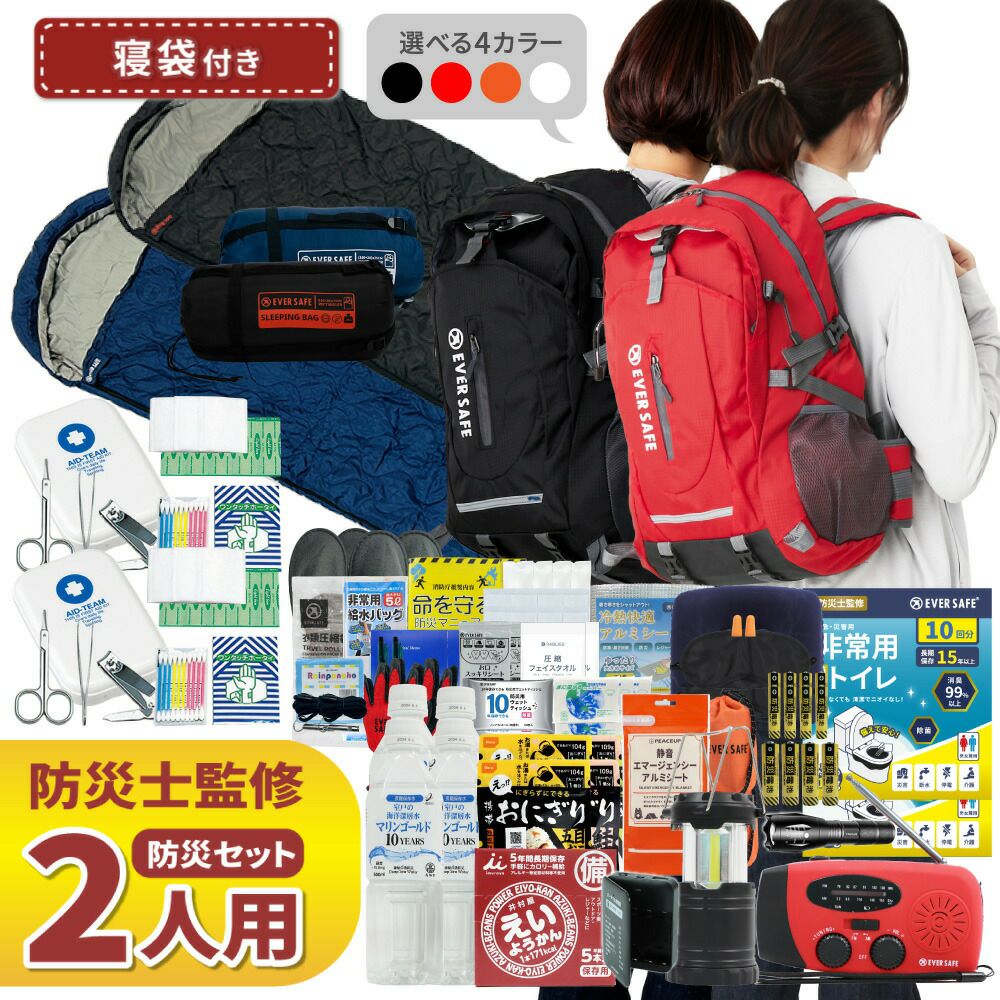 防災グッズ 防災セット 2人用 寝袋付き EVERSAFEリュック 防災士監修 救急セット 避難 地震 災害 防災食 防災寝具 防災ラジオ 長期保存水 非常用トイレ 懐中電灯 充電器 衛生用品 警戒レベル4 L4ESNB02