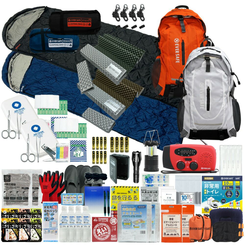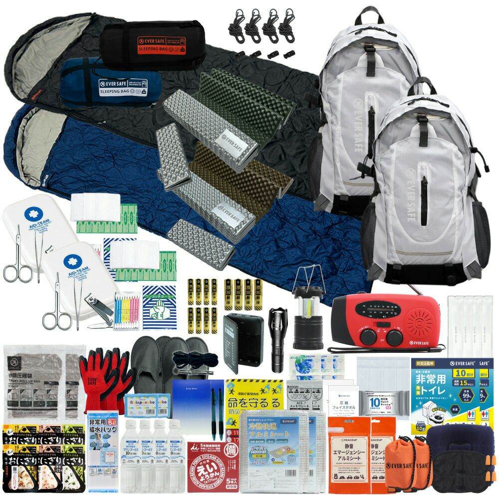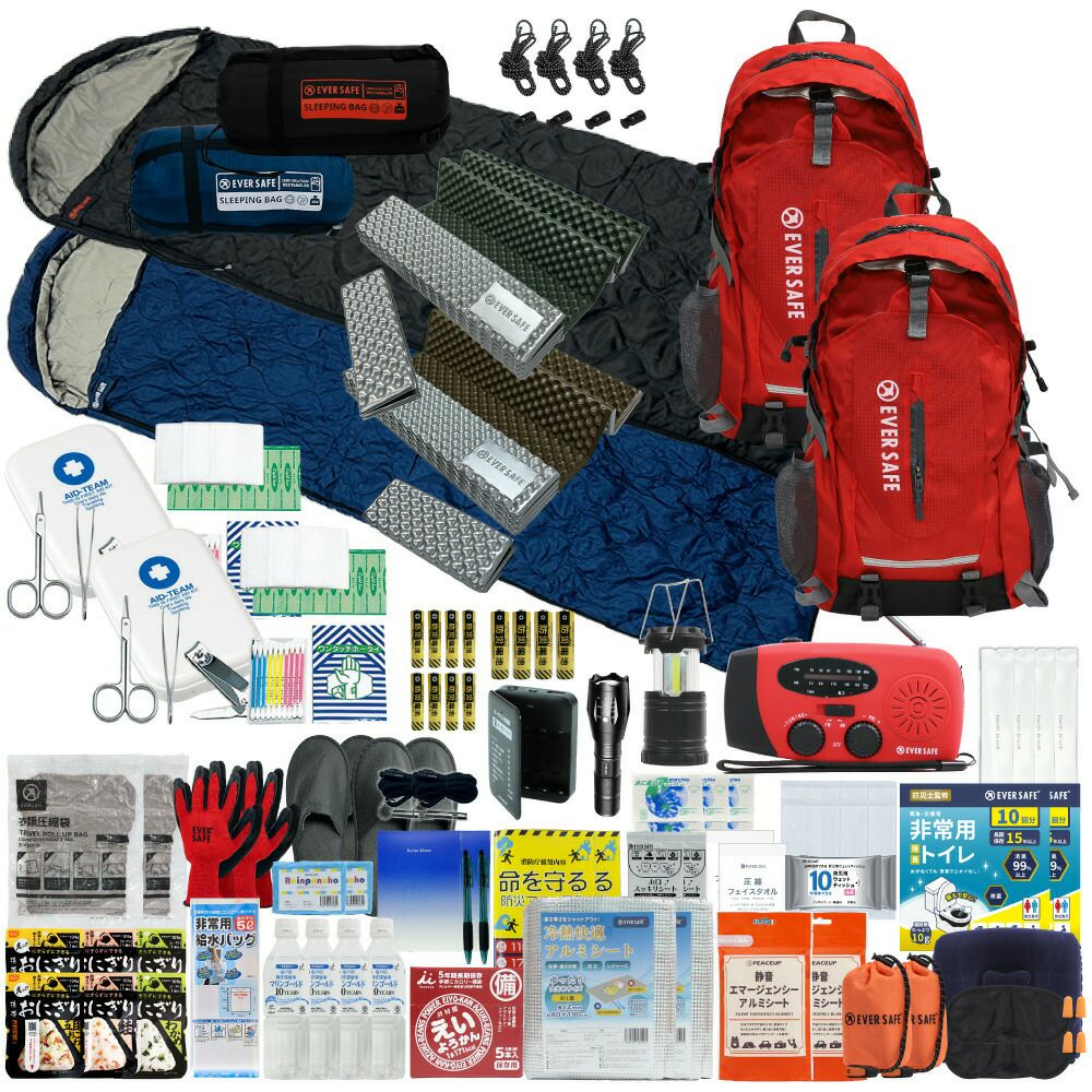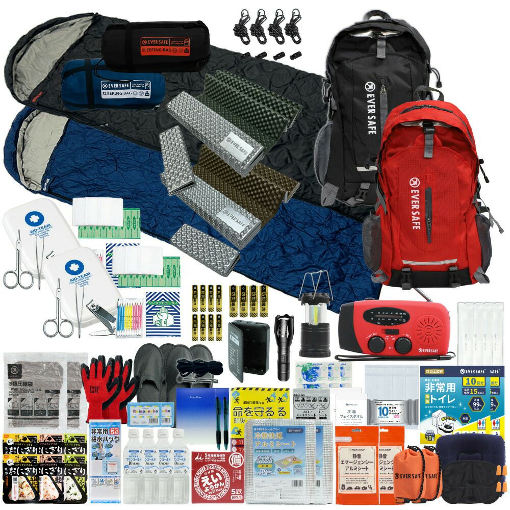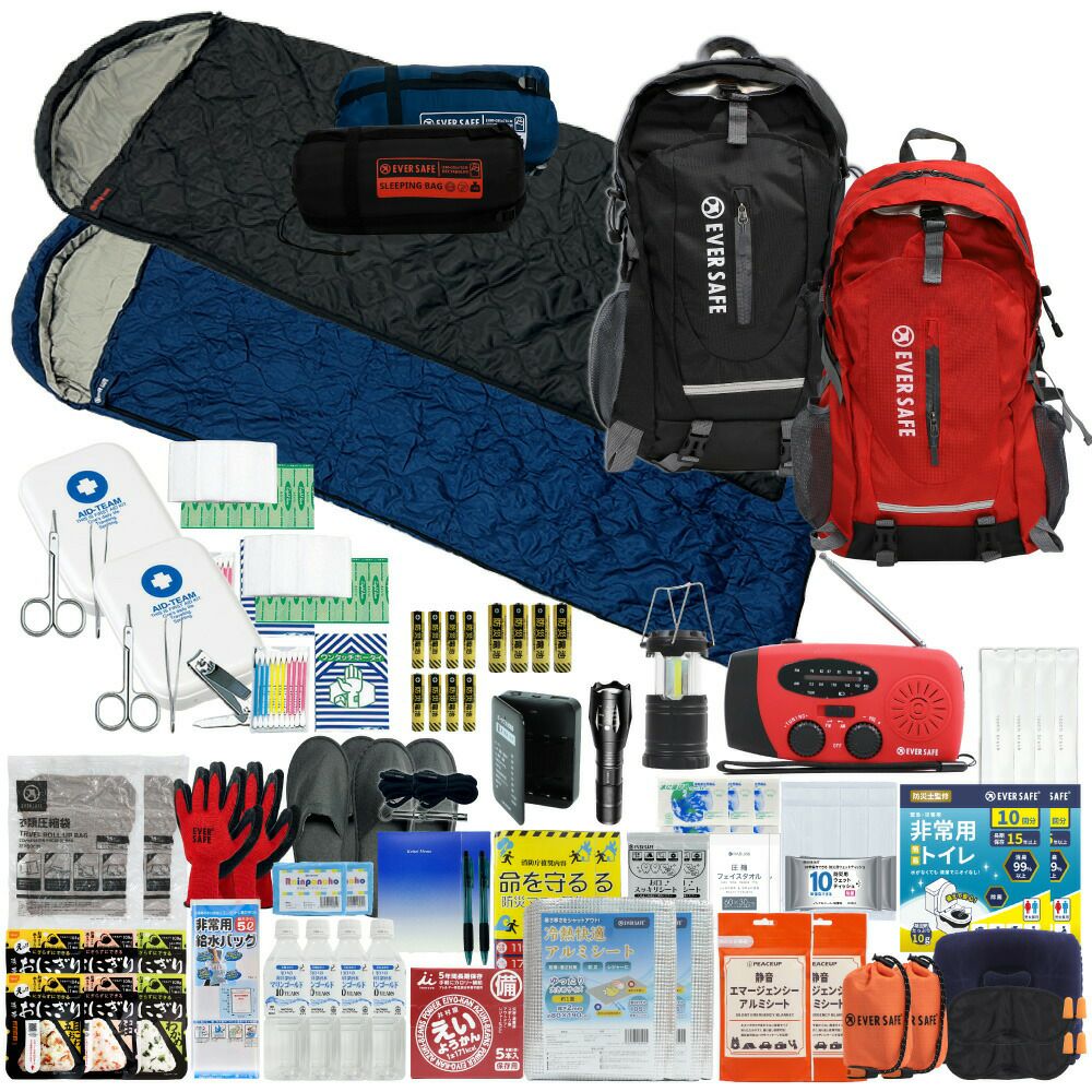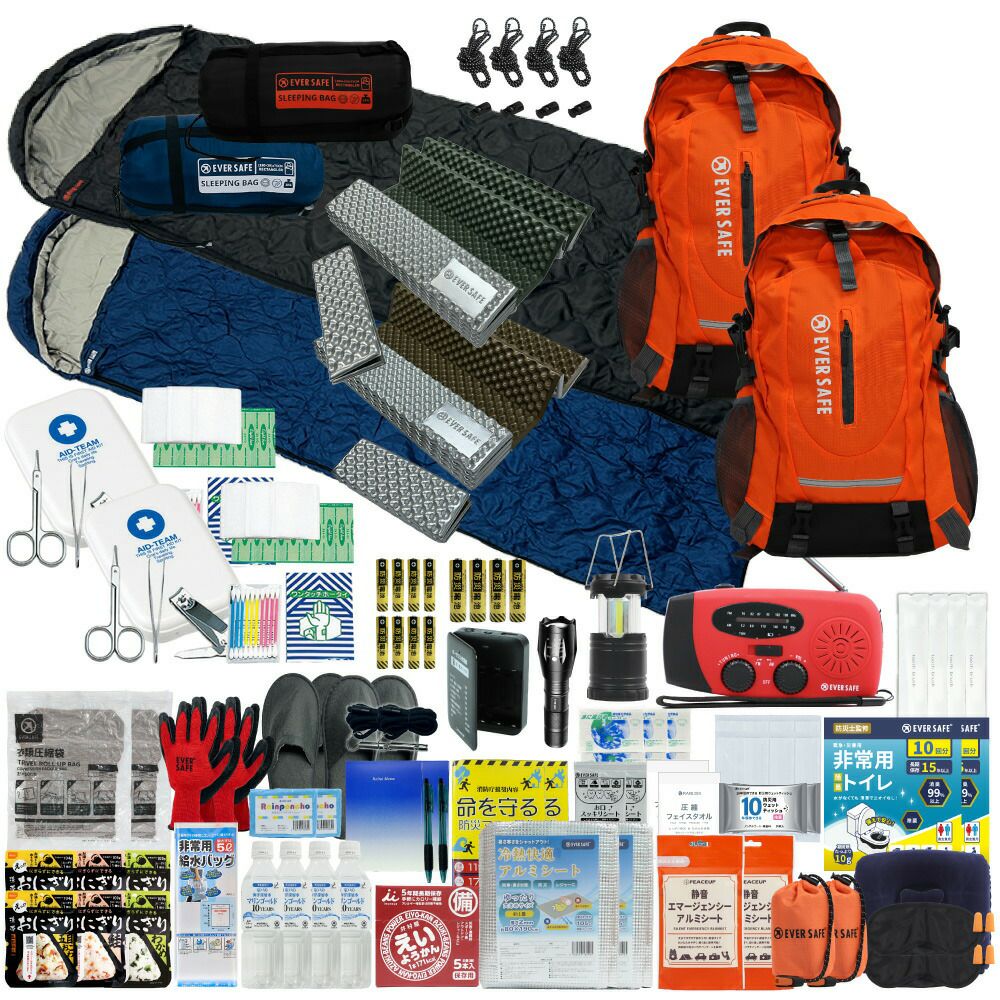防災グッズ 防災セット 2人用 寝袋付き EVERSAFEリュック 防災士監修 救急セット 避難 地震 災害 防災食 防災寝具 防災ラジオ 長期保存水 非常用トイレ 懐中電灯 充電器 衛生用品 警戒レベル4 L4ESNB02