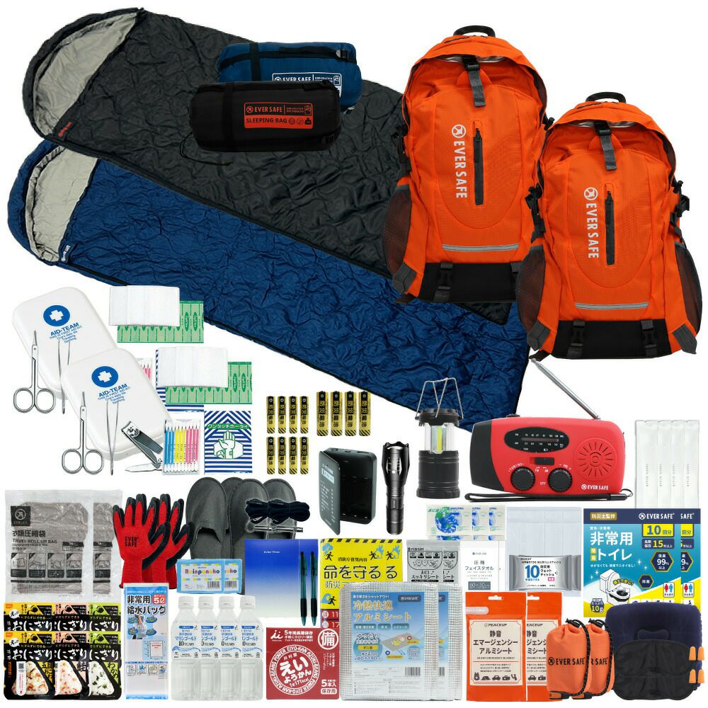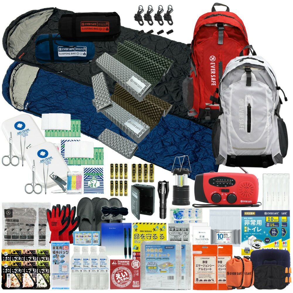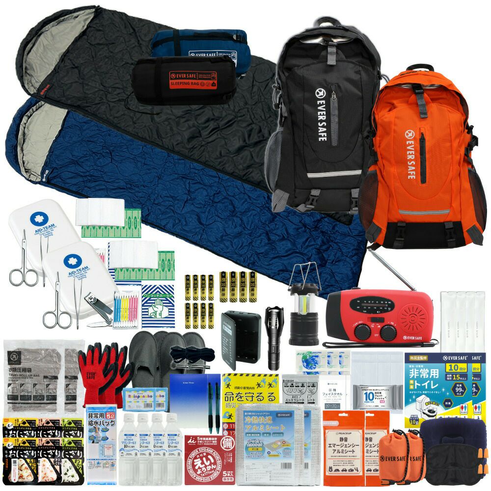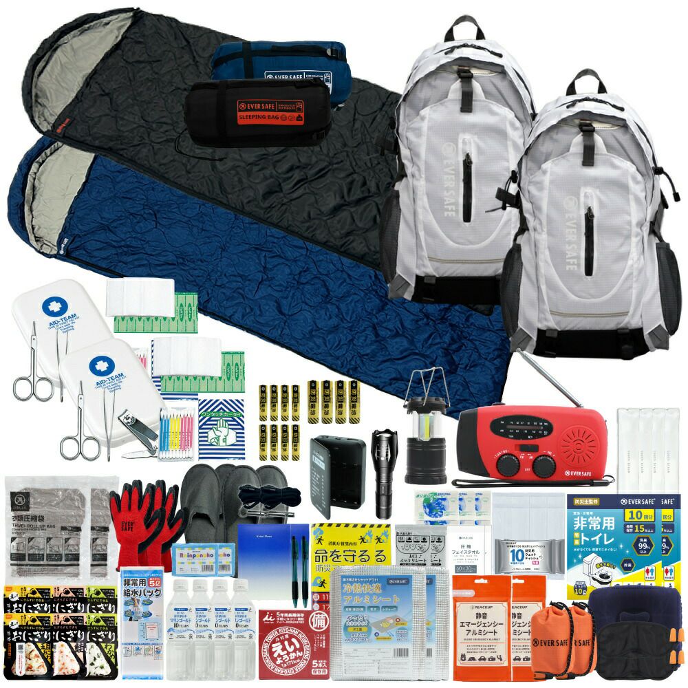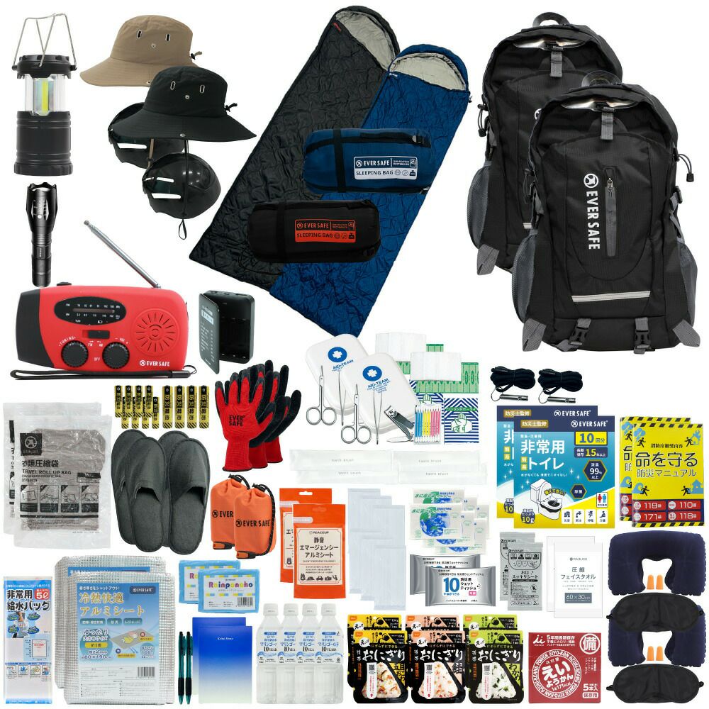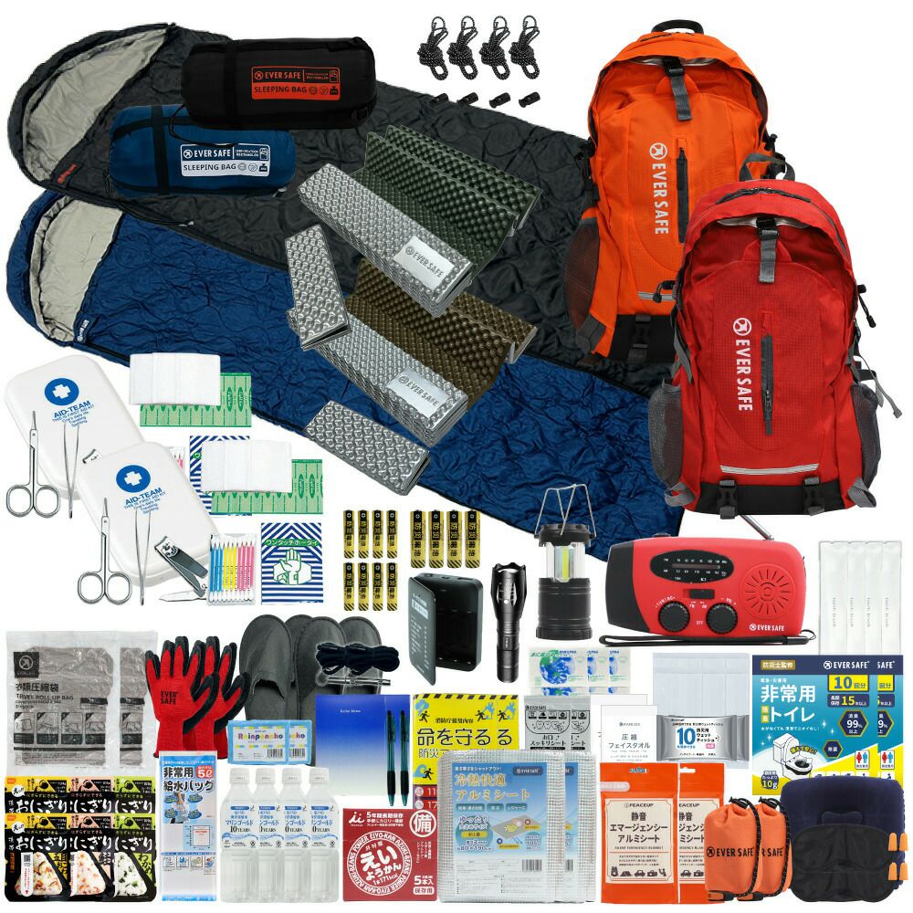 防災グッズ 防災セット 2人用 寝袋付き EVERSAFEリュック 防災士監修 救急セット 避難 地震 災害 防災食 防災寝具 防災ラジオ 長期保存水 非常用トイレ 懐中電灯 充電器 衛生用品 警戒レベル4 L4ESNB02