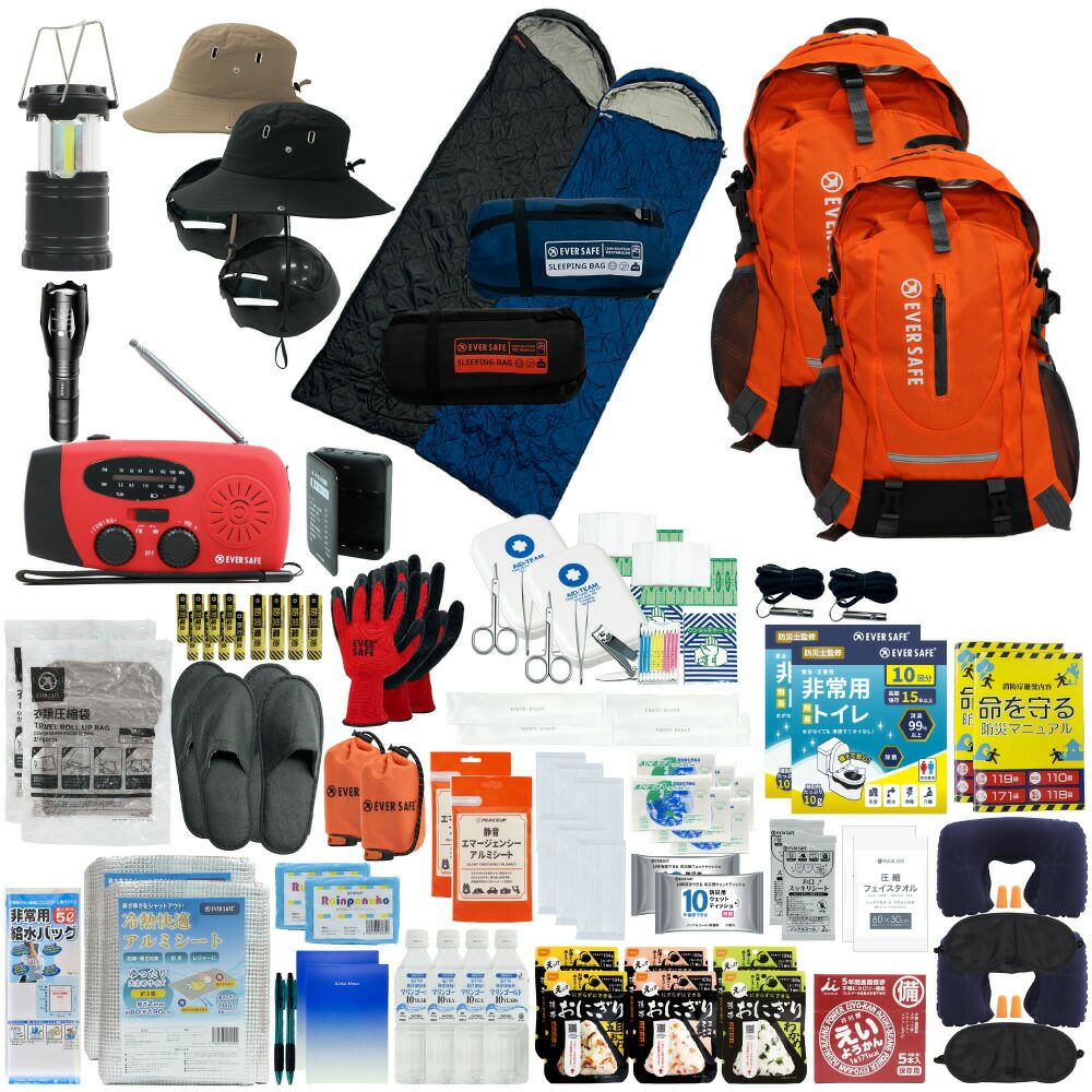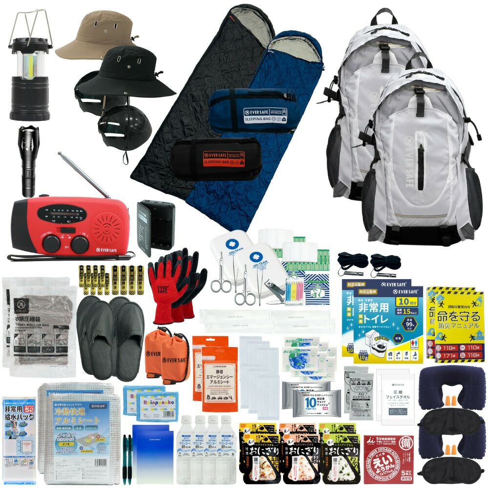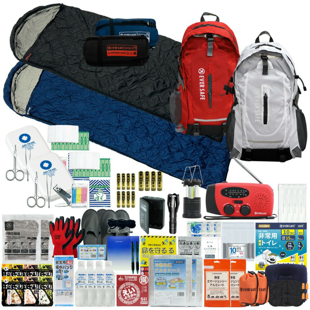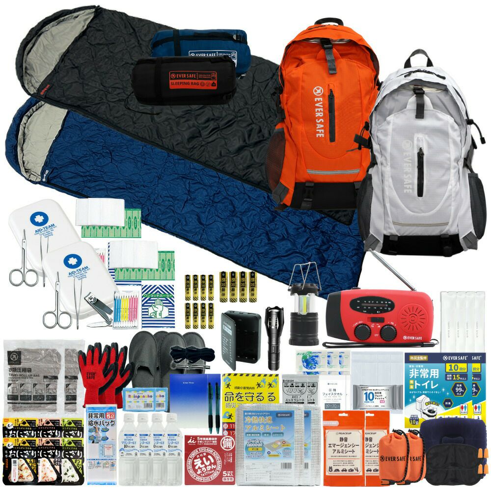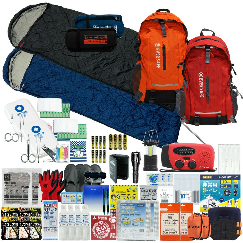 防災グッズ 防災セット 2人用 寝袋付き EVERSAFEリュック 防災士監修 救急セット 避難 地震 災害 防災食 防災寝具 防災ラジオ 長期保存水 非常用トイレ 懐中電灯 充電器 衛生用品 警戒レベル4 L4ESNB02