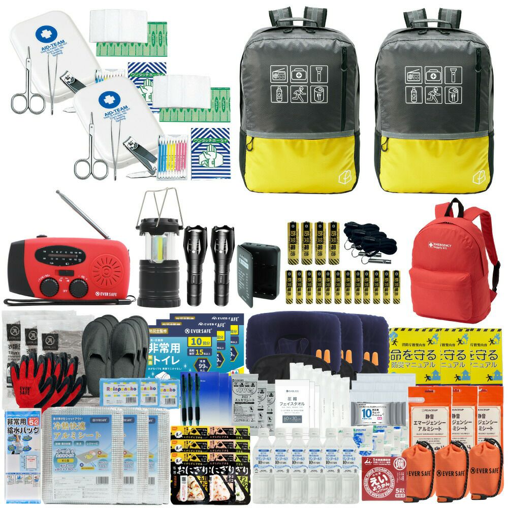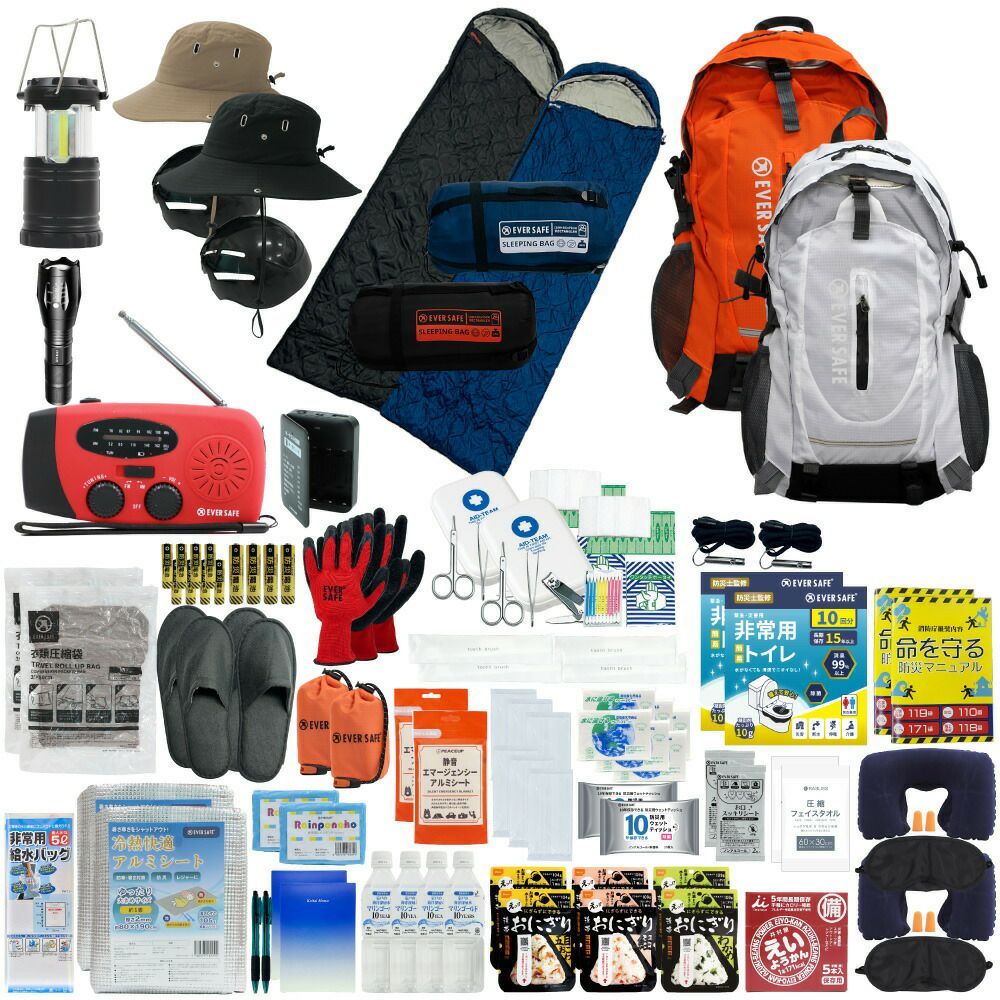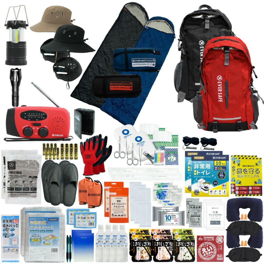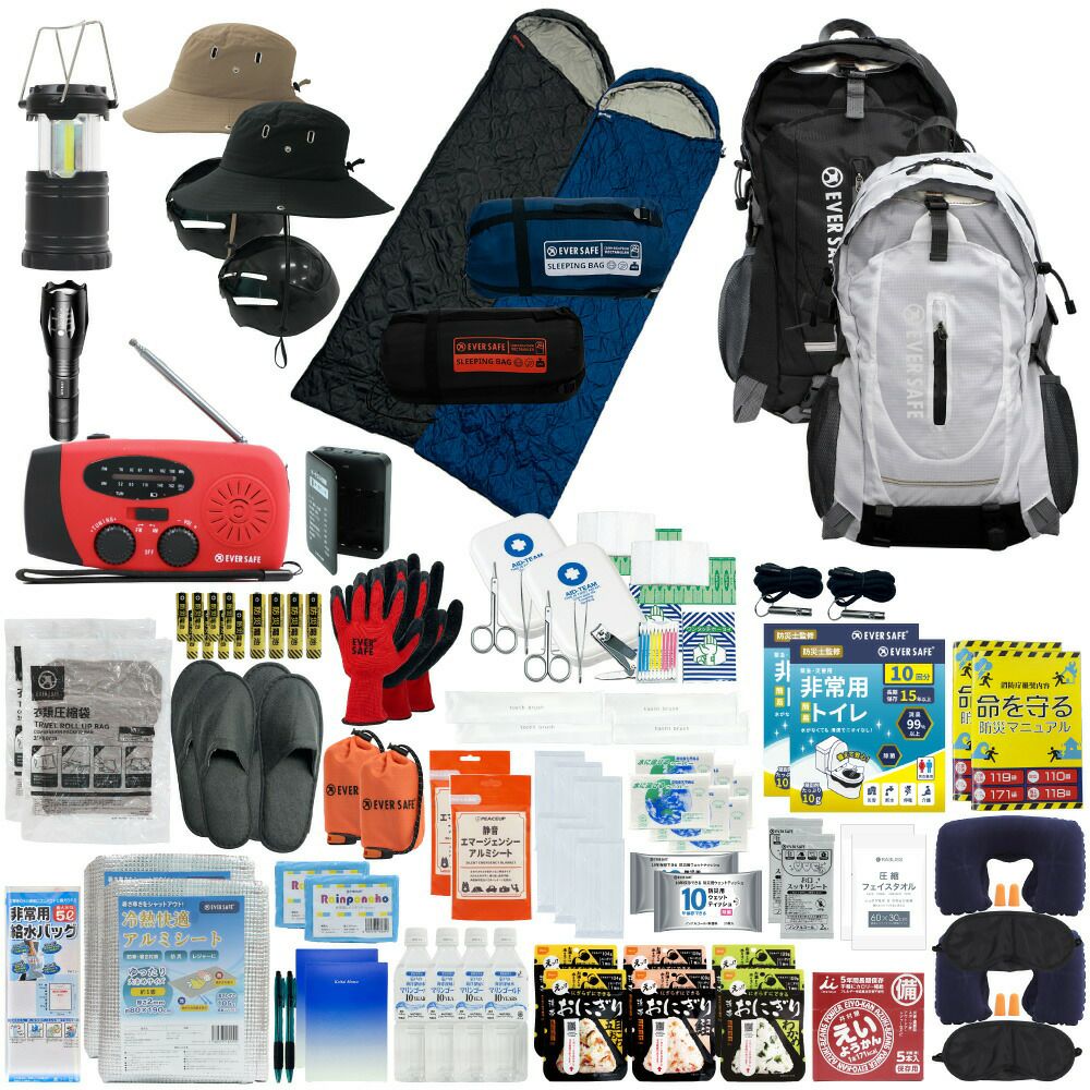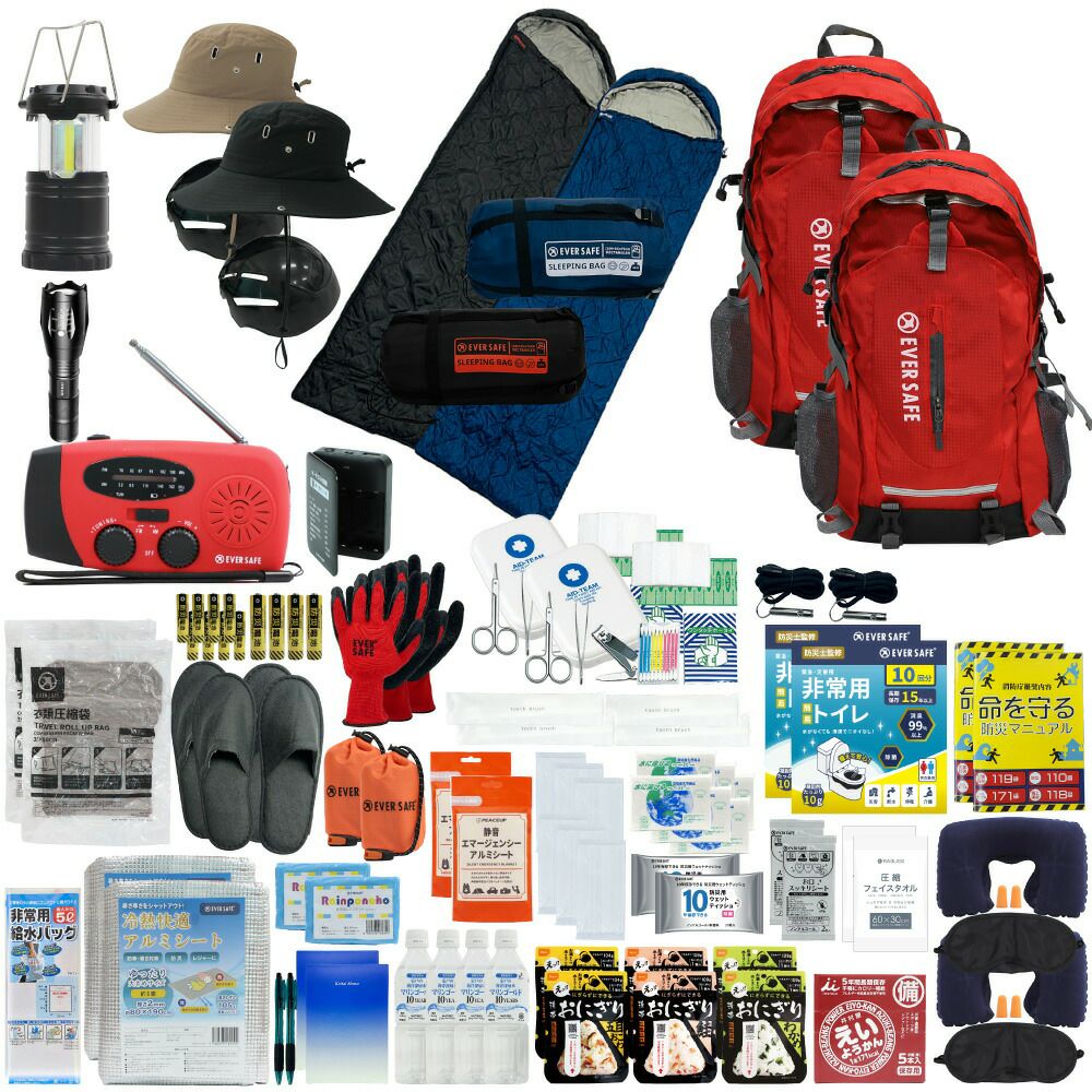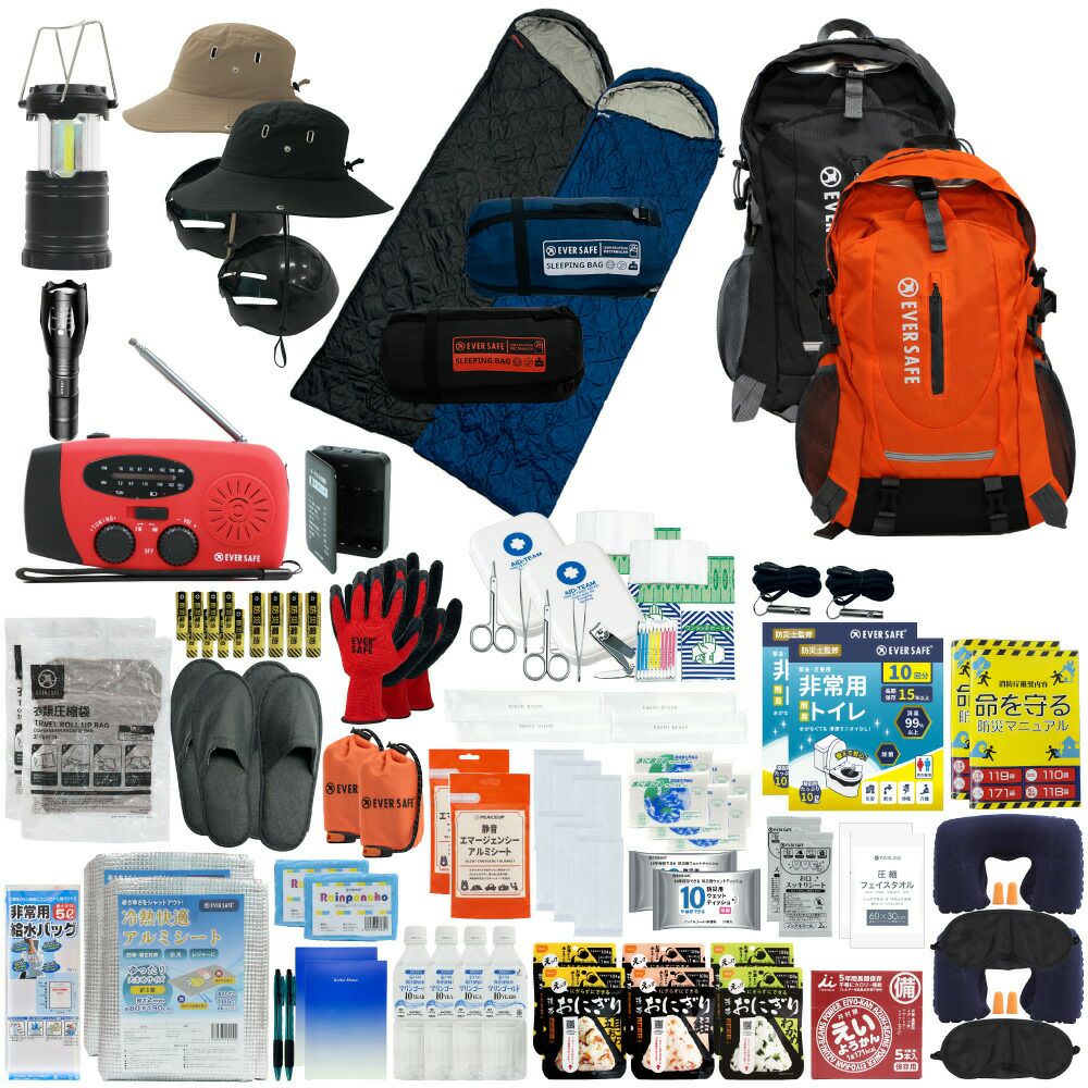 防災グッズ 防災セット 2人用 寝袋付き EVERSAFEリュック 防災士監修 救急セット 避難 地震 災害 防災食 防災寝具 防災ラジオ 長期保存水 非常用トイレ 懐中電灯 充電器 衛生用品 警戒レベル4 L4ESNB02