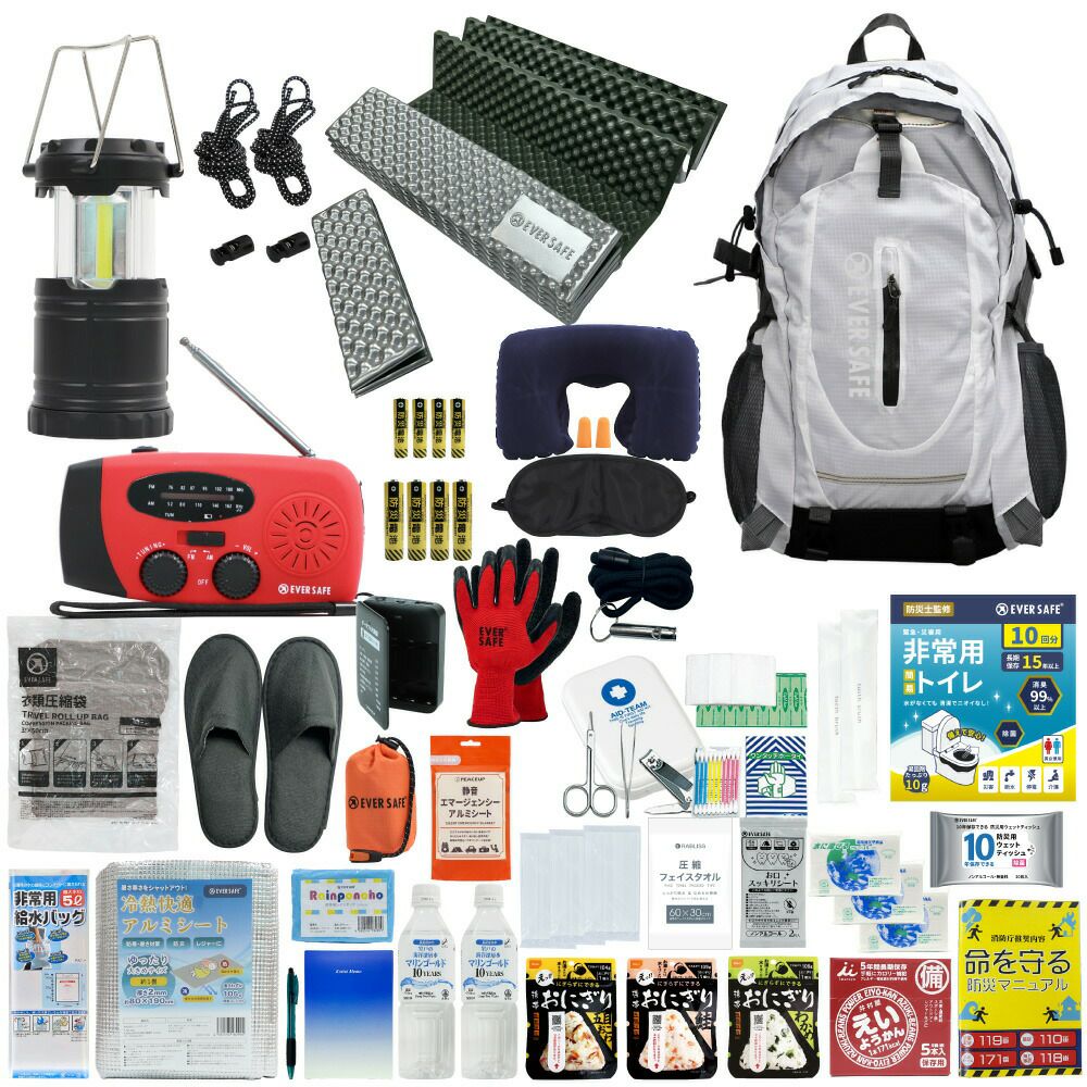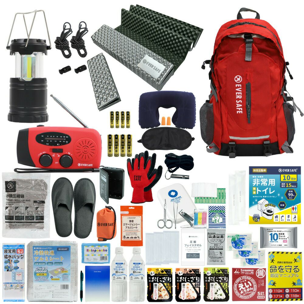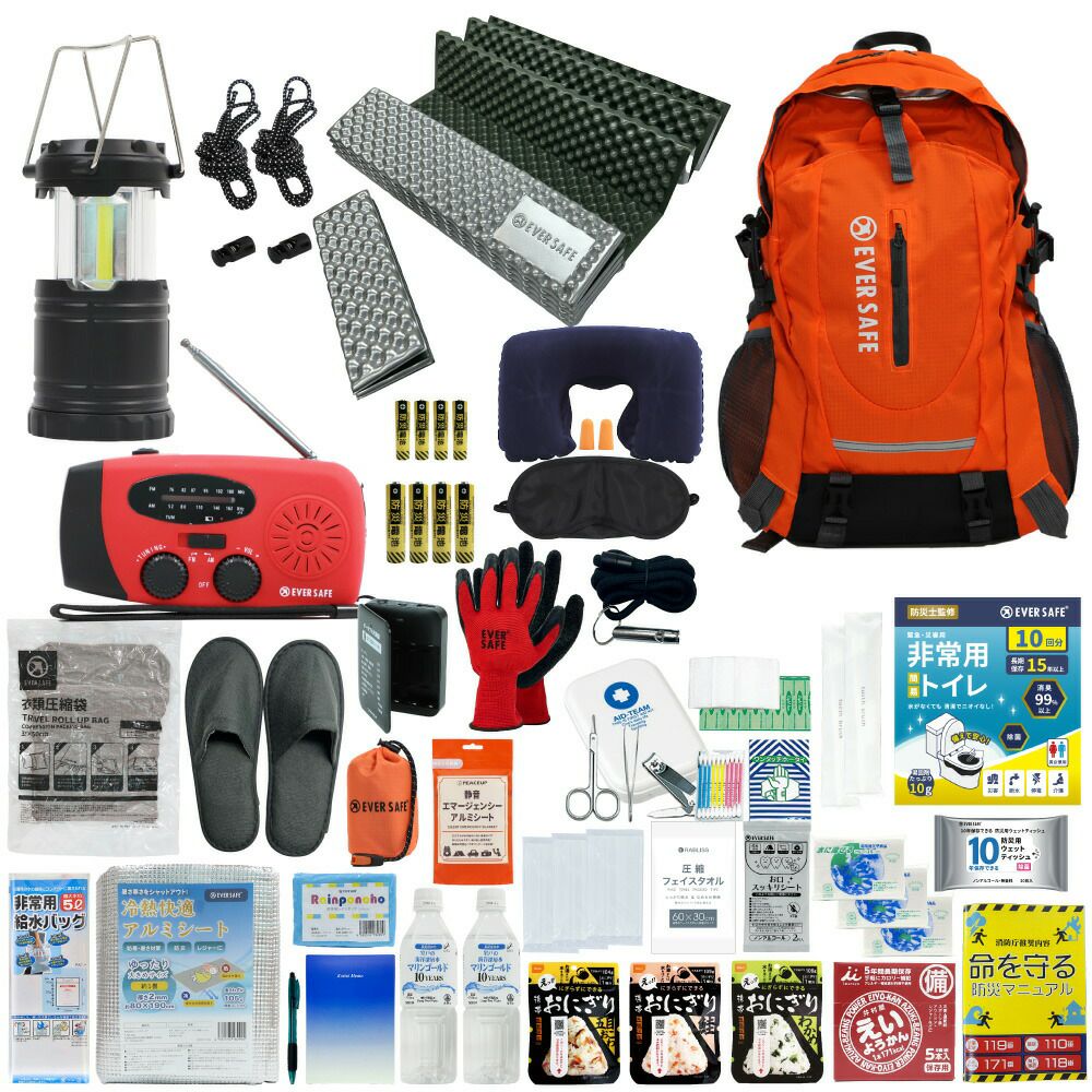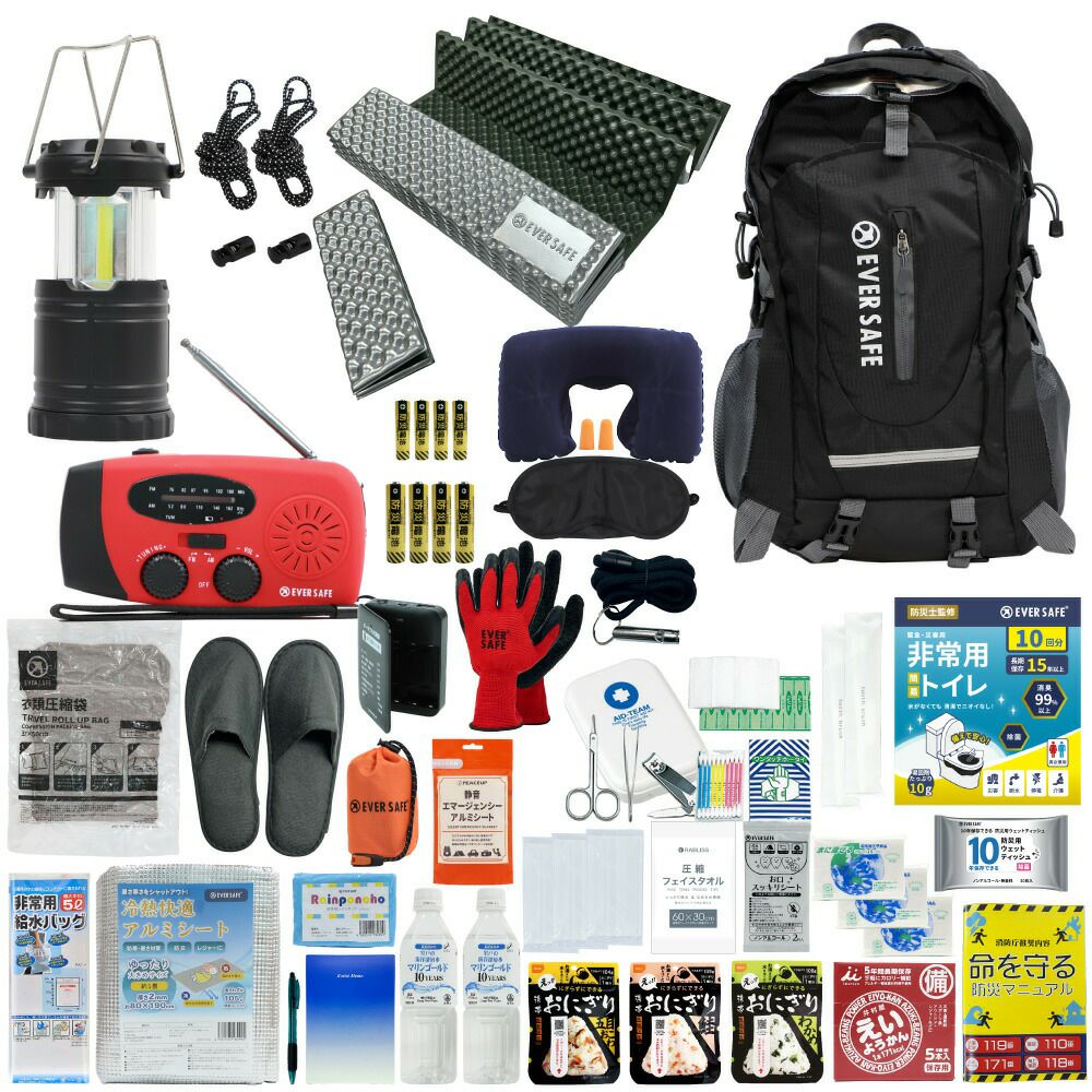 防災グッズ 防災セット 1人用 EVERSAFEリュック キャンプマット 防災士監修 防災リュック 撥水加工 非常食 保存水 防災ラジオ 簡易トイレ 救急セット 懐中電灯 衛生用品 警戒レベル4 超軽量 避難 アウトドア L4ESMT01