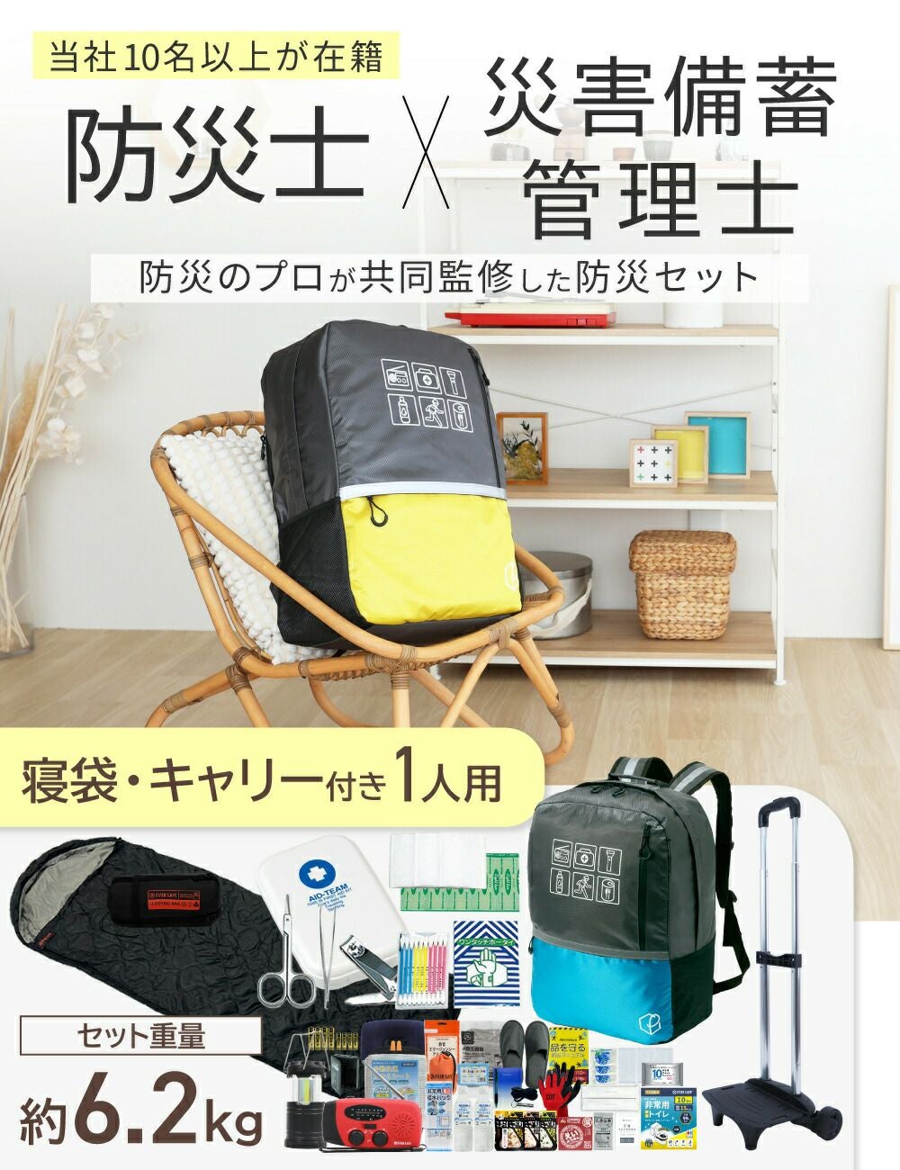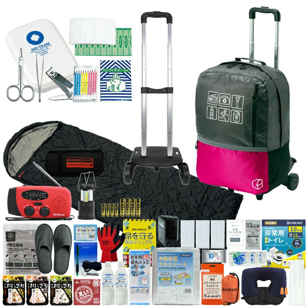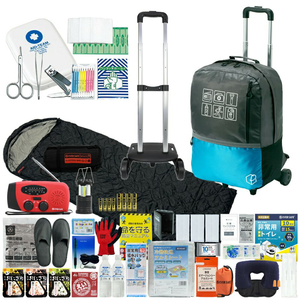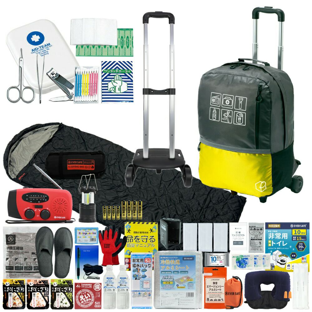持ち運びに便利なキャリー・寝袋が付いた充実の防災セット 軽量で大容量の防災リュック