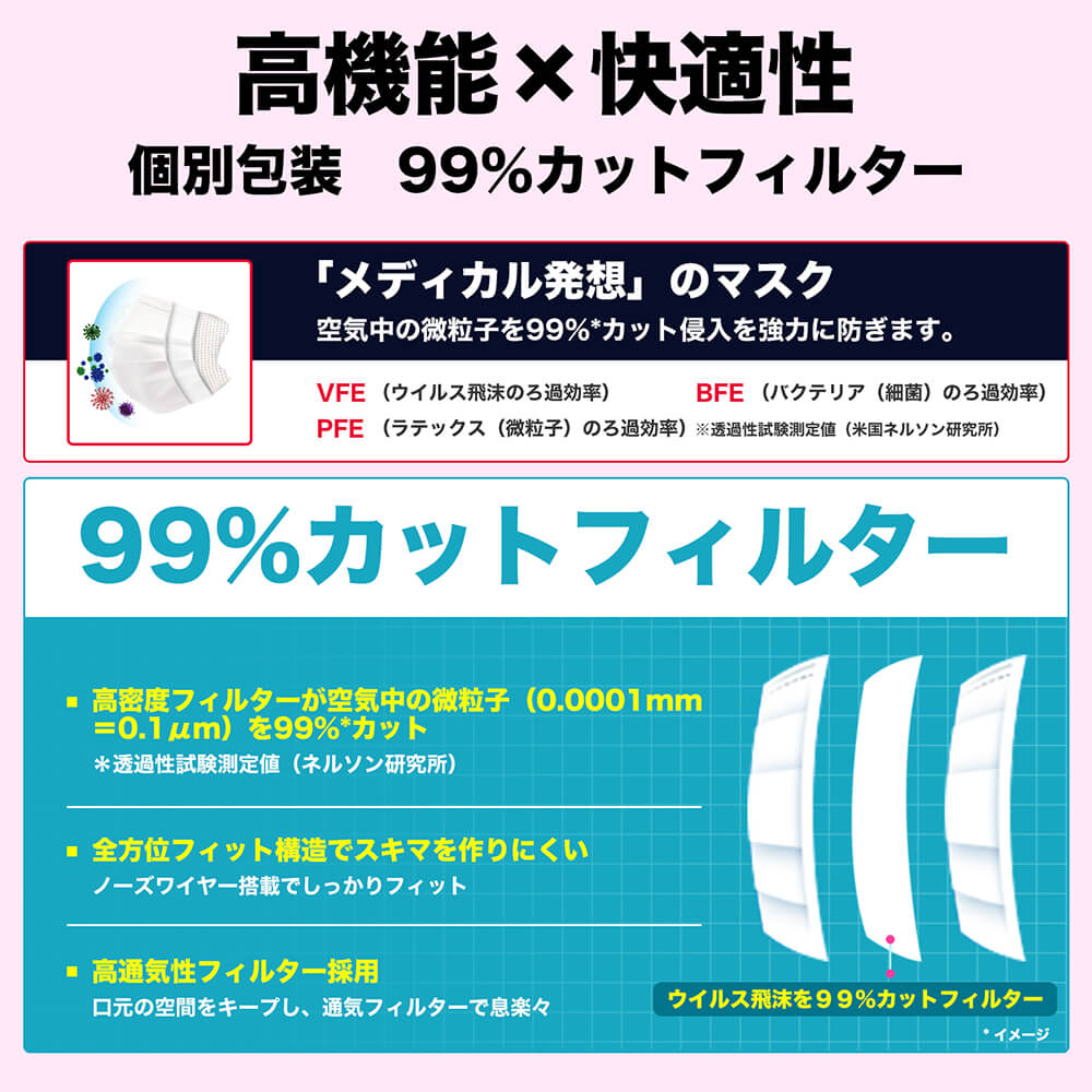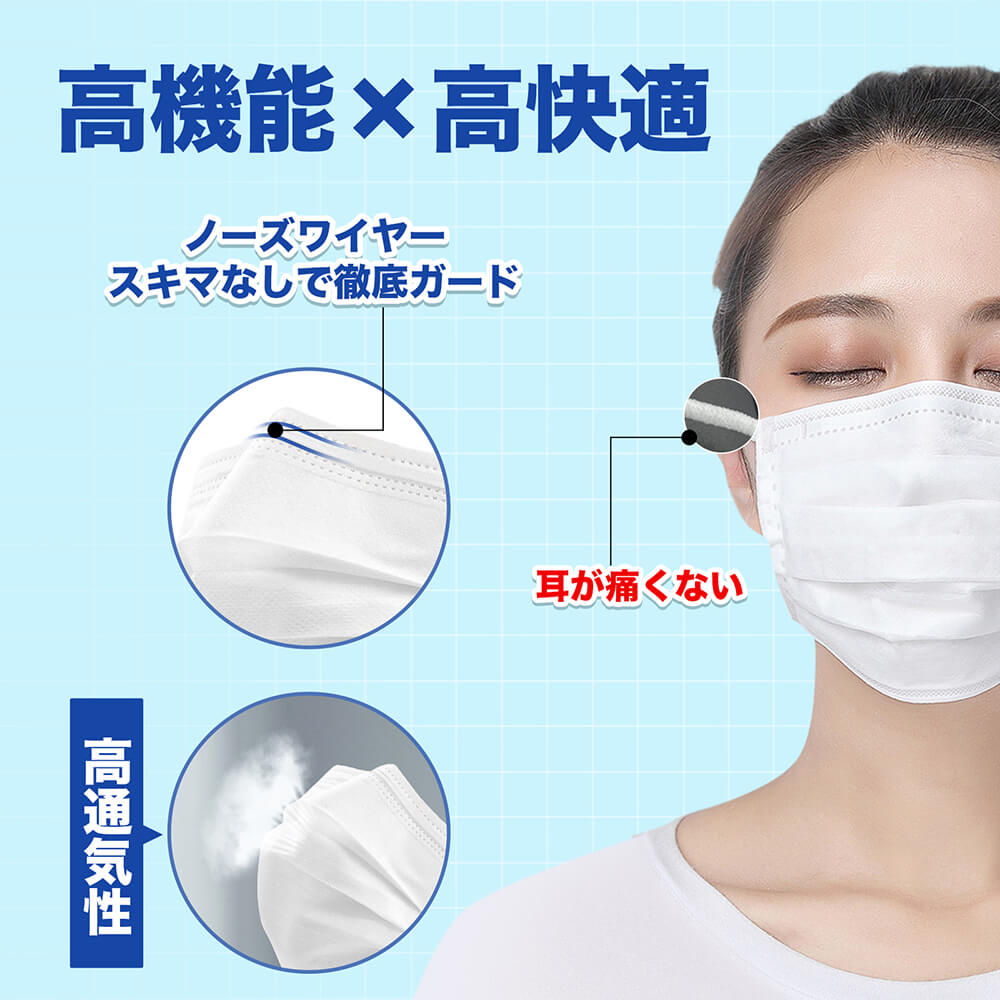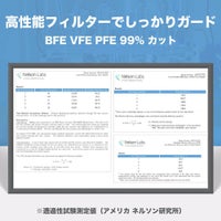 ・ウイルス飛沫、ハウスダスト、かぜ、花粉等のミクロ粒子をしっかり補足する不織布の3層構造フィルターを使用。