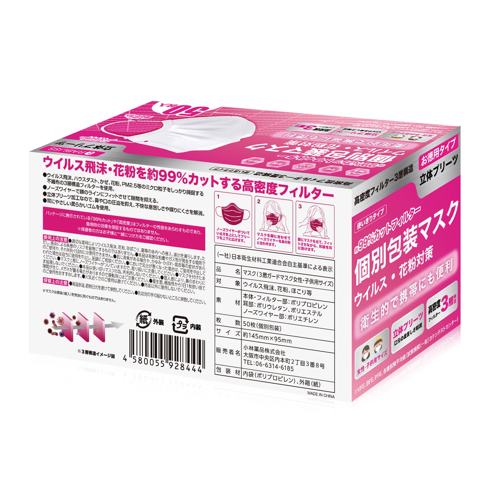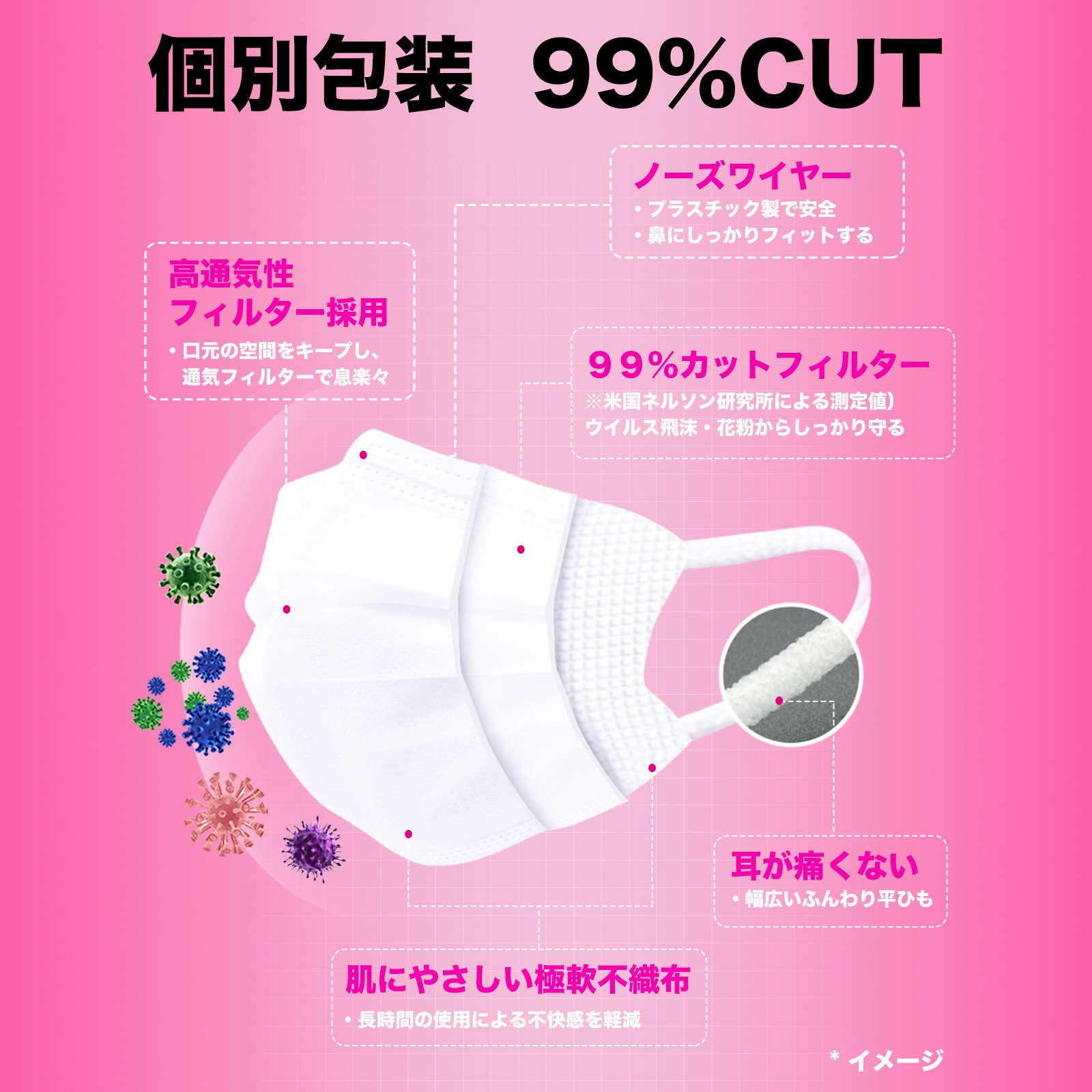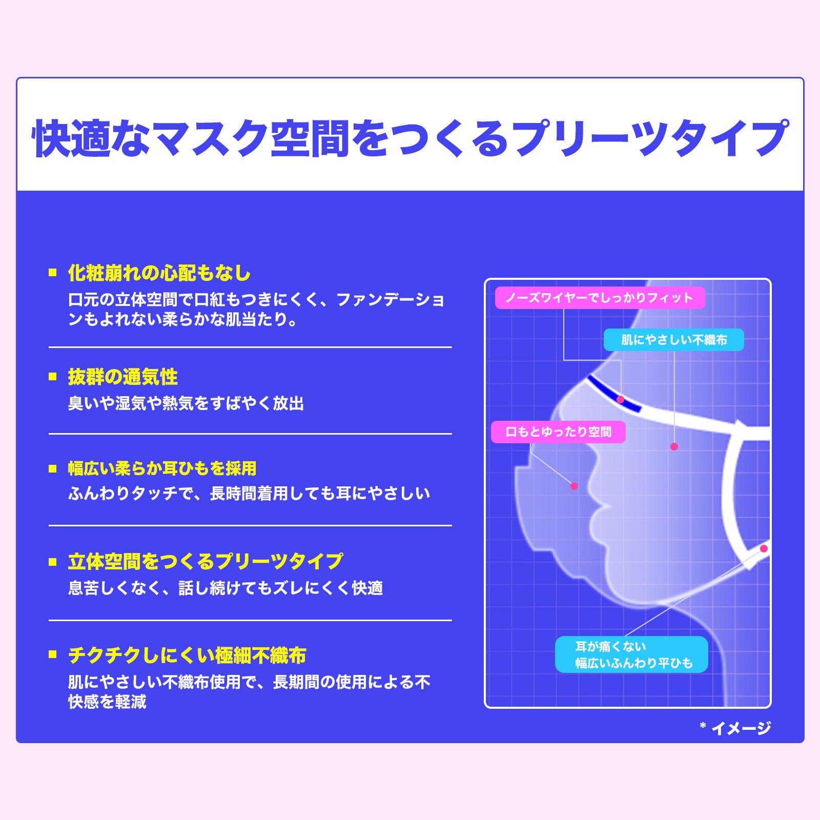 ・立体プリーツ加工なので、鼻や口の圧迫を抑え、不快な息苦しさや喋りにくさを解消。