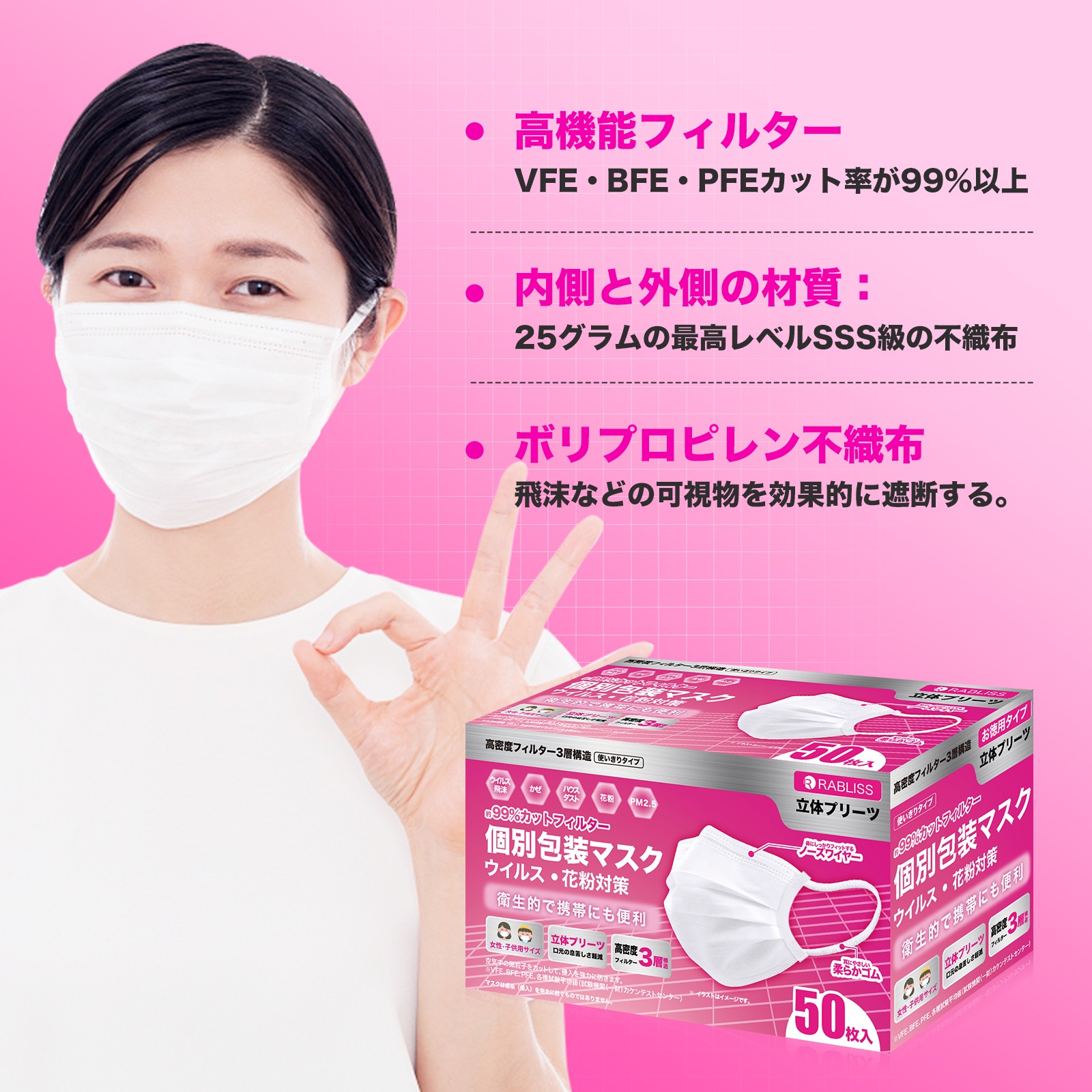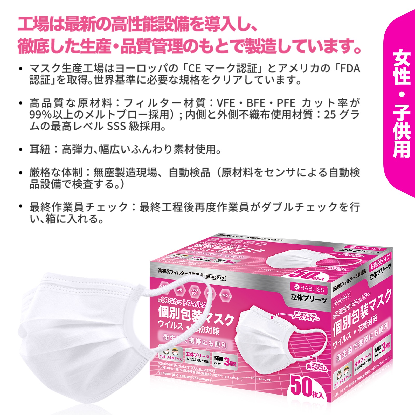 RABLISS 個包装マスク 女性・子供用 50枚入 30箱セット