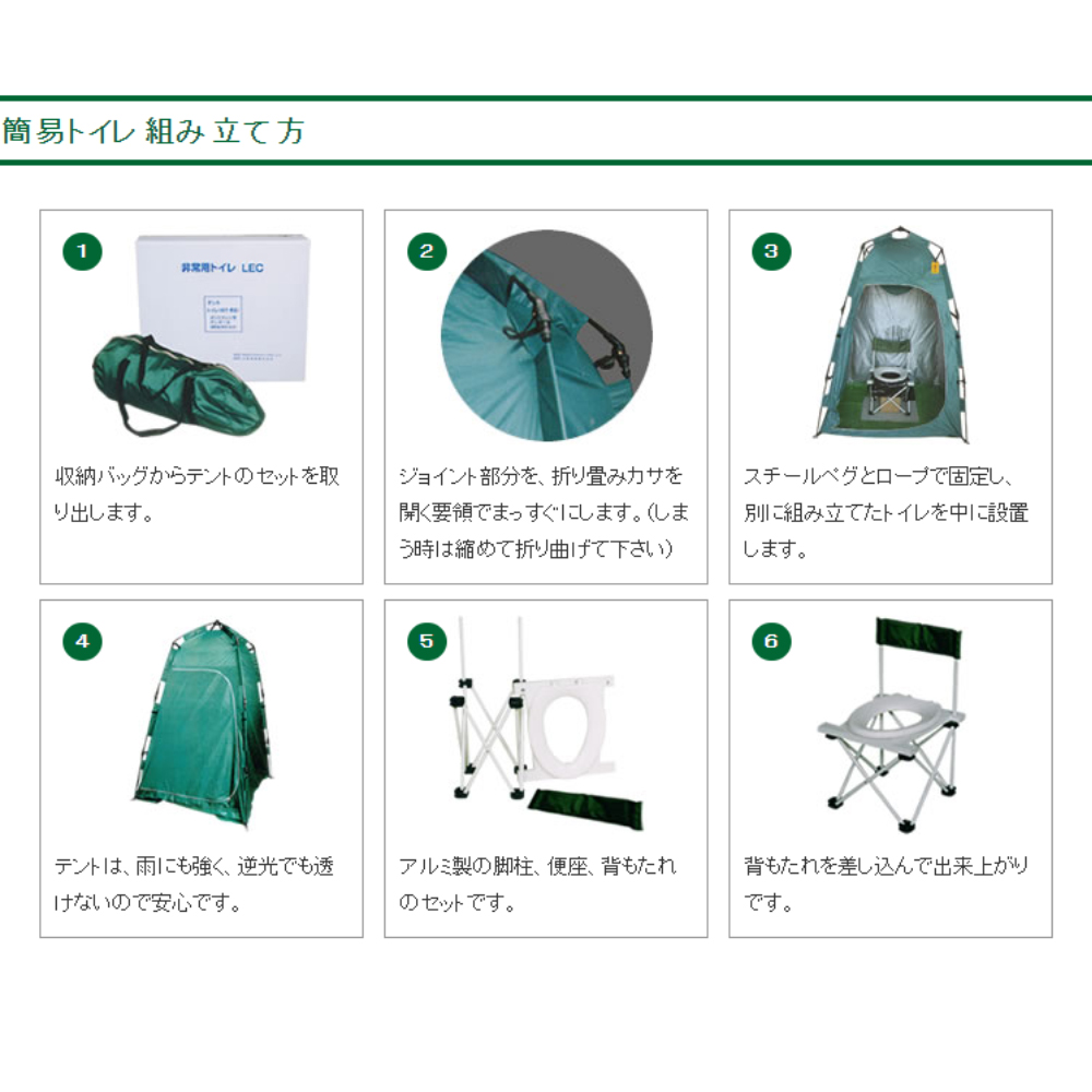 テント付だからプライバシーが守られます。 断水時でも汚物を焼却処理可能で清潔。 組み立ては工具不要で設置も簡単!設置場所を選びません! 背もたれ付きでお子様や年配者にも安全です。 背もたれくん総合セット