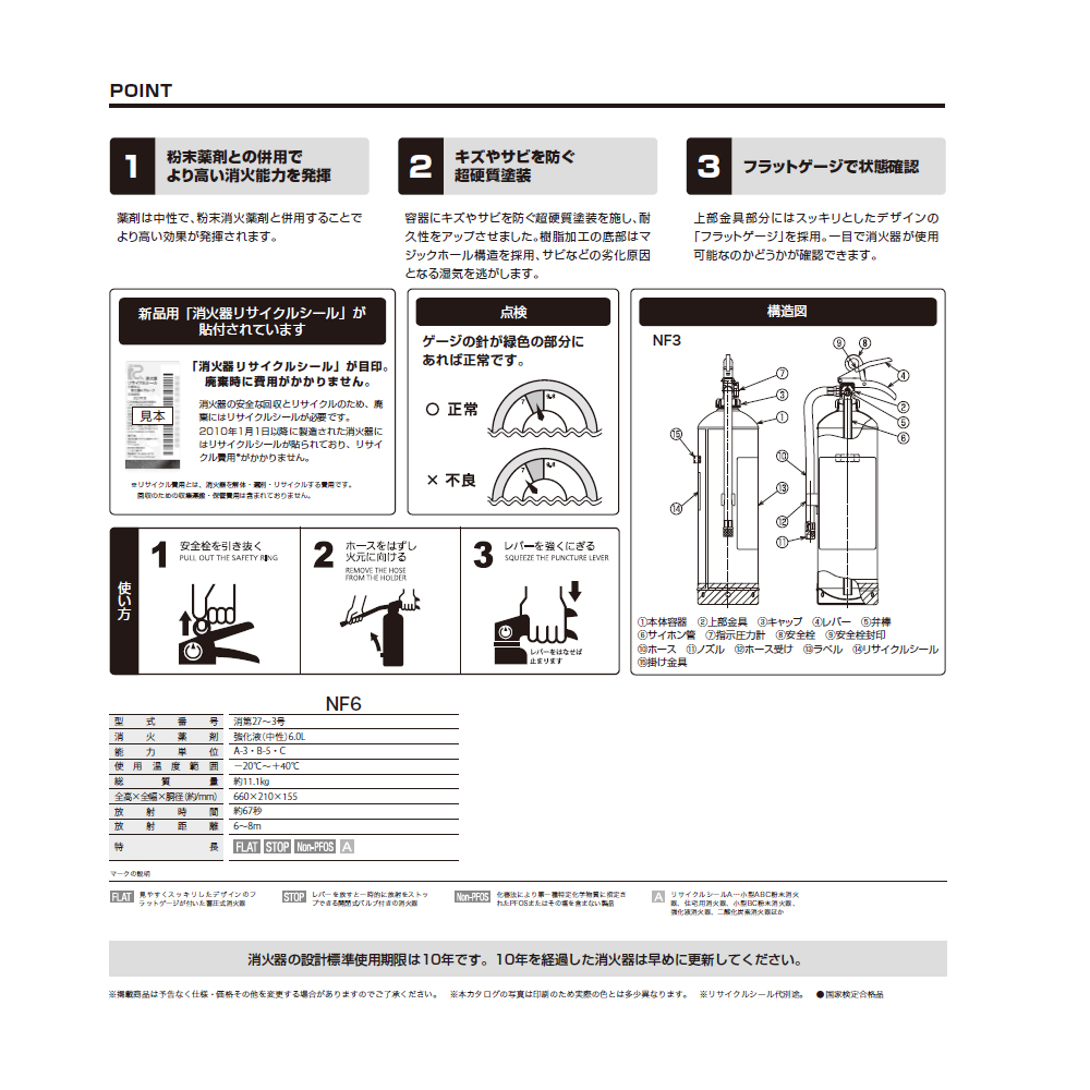 上部金具部分にはスッキリとしたデザインの「フラットゲージ」を採用。一目で消化器が使用可能かどうか確認できます。
