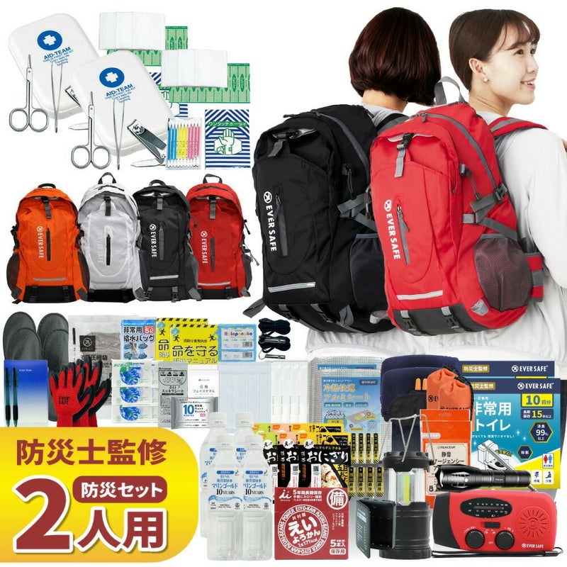6. 防災グッズ 防災セット 2人用 EVERSAFEリュック 防災士監修 救急セット 避難 地震 災害 防災食 防災寝具 防災ラジオ 長期保存水 非常用トイレ 懐中電灯 衛生用品 警戒レベル4 超軽量 撥水加工 L4ES02