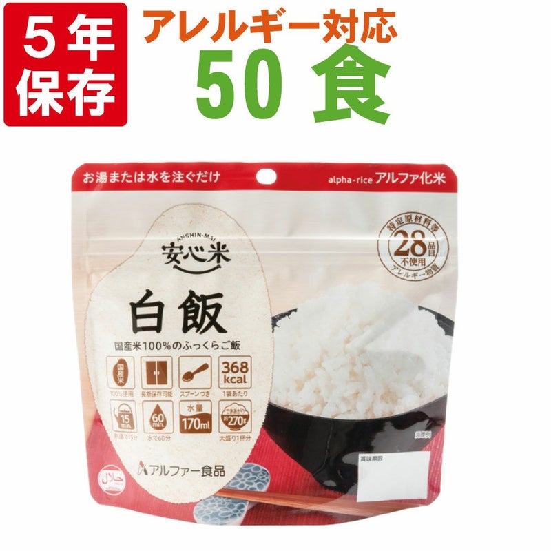 特定原材料等(アレルギー物質)28品目不使用 非常食 アルファ米 安心米「白飯 50食セット/箱」5年保存 国産米100%