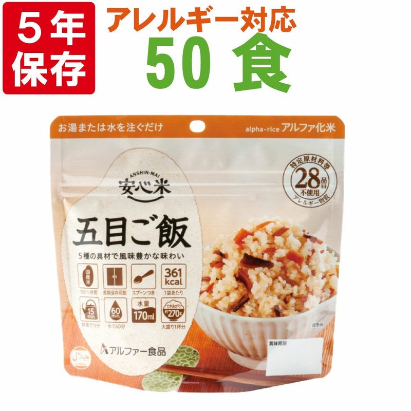 特定原材料等(アレルギー物質)28品目不使用、ハラール認証取得 非常食 アルファ米 安心米「五目ご飯 50食セット/箱」5年保存 国産米100%