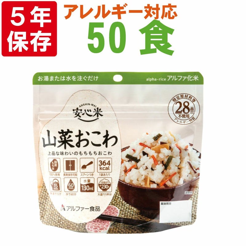 5. 非常食 アルファ米 安心米「山菜おこわ 50食セット/箱」5年保存 国産米100%