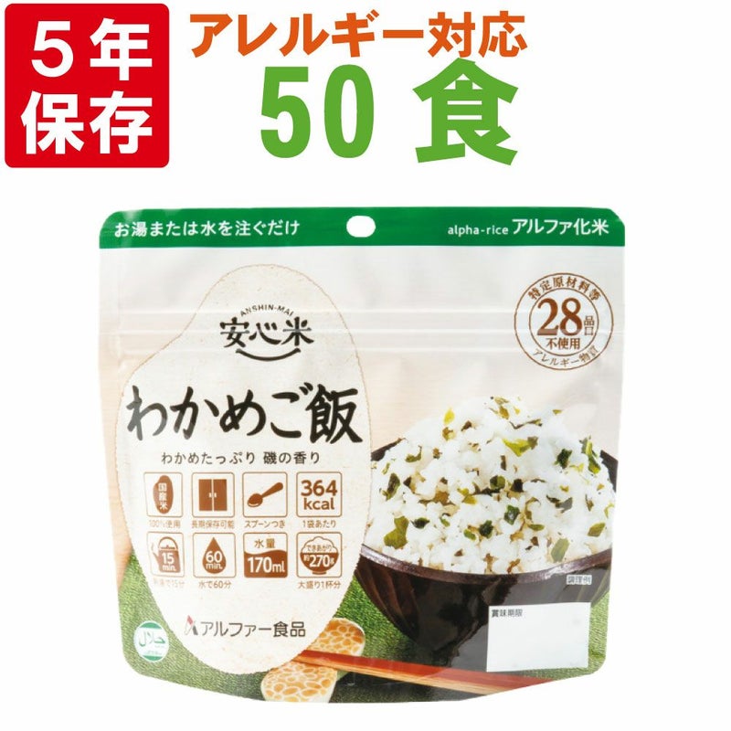 5. 非常食 アルファ米 安心米「わかめご飯 50食セット/箱」5年保存 国産米100%