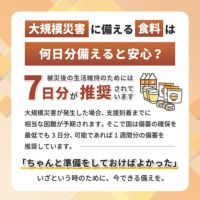 災害から支援物資が届くまでの最低3日分~7日分の水と食料を備えて置くことが推奨されています。