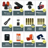 多機能防災コンパクト ラジオライト | 1 | サイズ:(約)130×50×60mm 重量:(約)213g LEDライト:1W/30lm 使用電源:3.7v/2000mAh 作動電圧: 2.7-4.2V 最大消費電力:1.5W 出力電圧/電流:5.1V/850mA 防水機能:IPX3 素材:ABS/PC/PVC 付属品:ラジオ本体、USBケーブル type-C、ライトニング・type-B対応アタッチメント、説明書 |