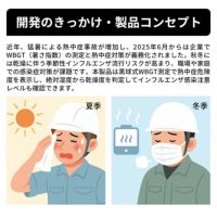 本製品は黒球式WBGT測定で暑さ危険度を表示し、絶対湿度から乾燥度を判定してインフルエンザ注意レベルも確認できます。