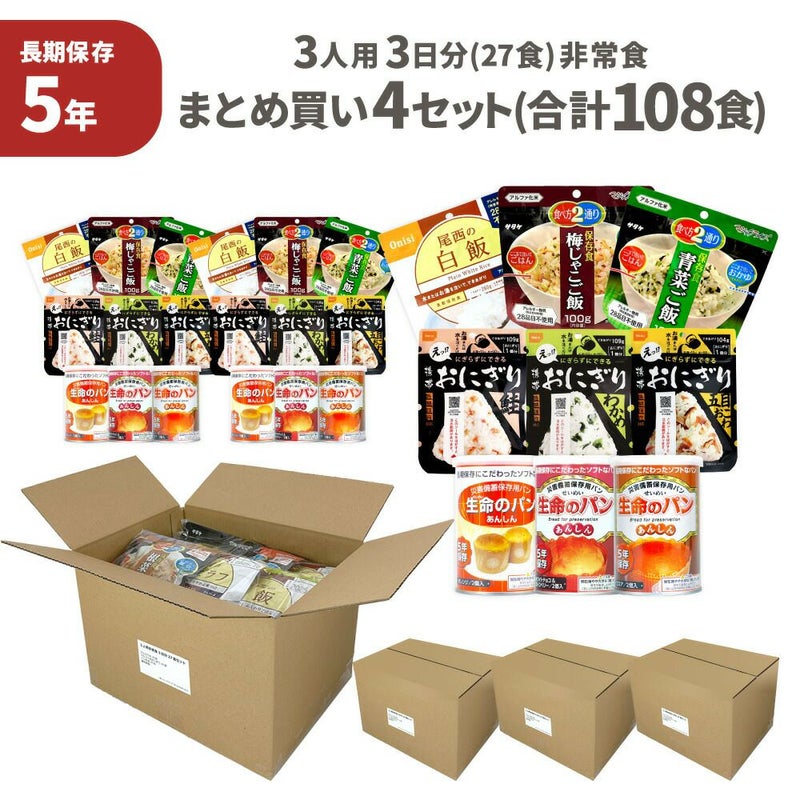 【関連ワード】 非常用持ち出し袋 防災備蓄品 108食分 3人用3日間分 12人分 お湯で作る 水で作れる 尾西 サタケ 生命のパン 缶入りパン おむすび 4ケース 纏め買い オフィス向け 企業向け 法人向け 団体向け 家族向け ケース販売