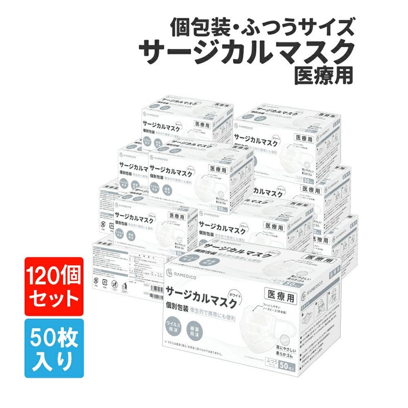 3. 大人用 サージカルマスク50枚入×120箱(30箱/ケース×4) 個別包装 医療用 RAMEDICO KE721 ふつうサイズ 日本産業規格適合 不織布