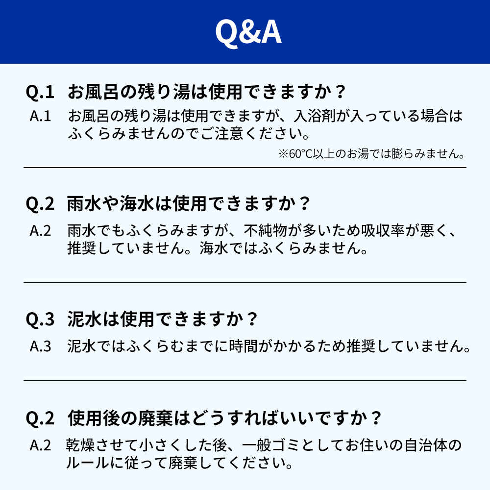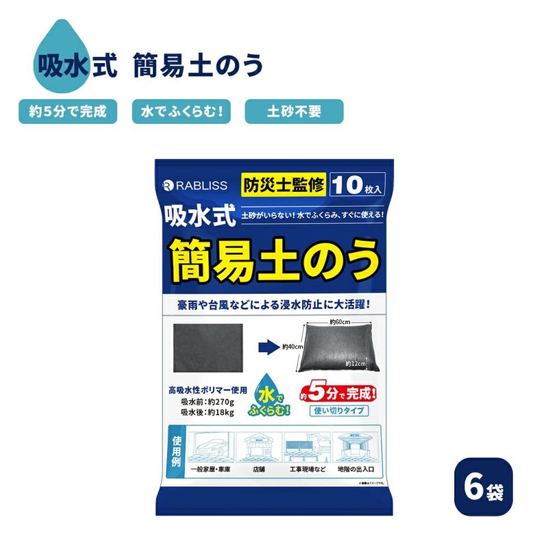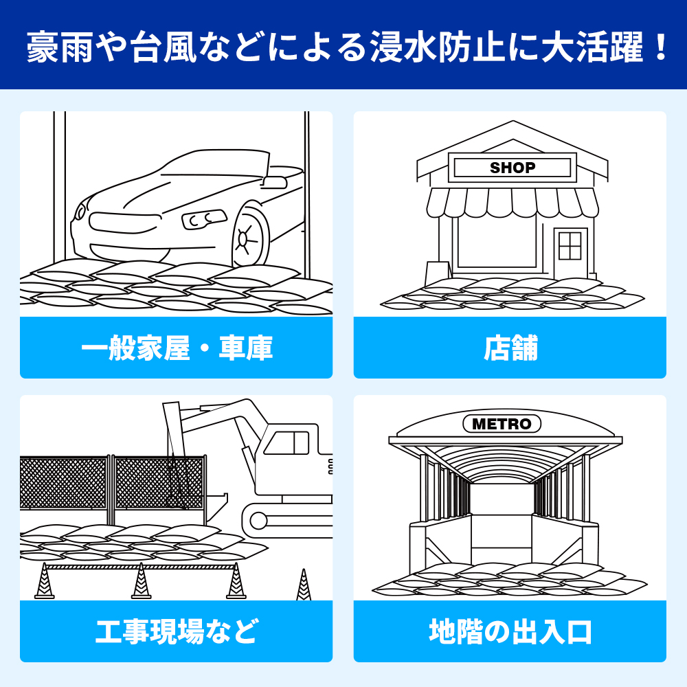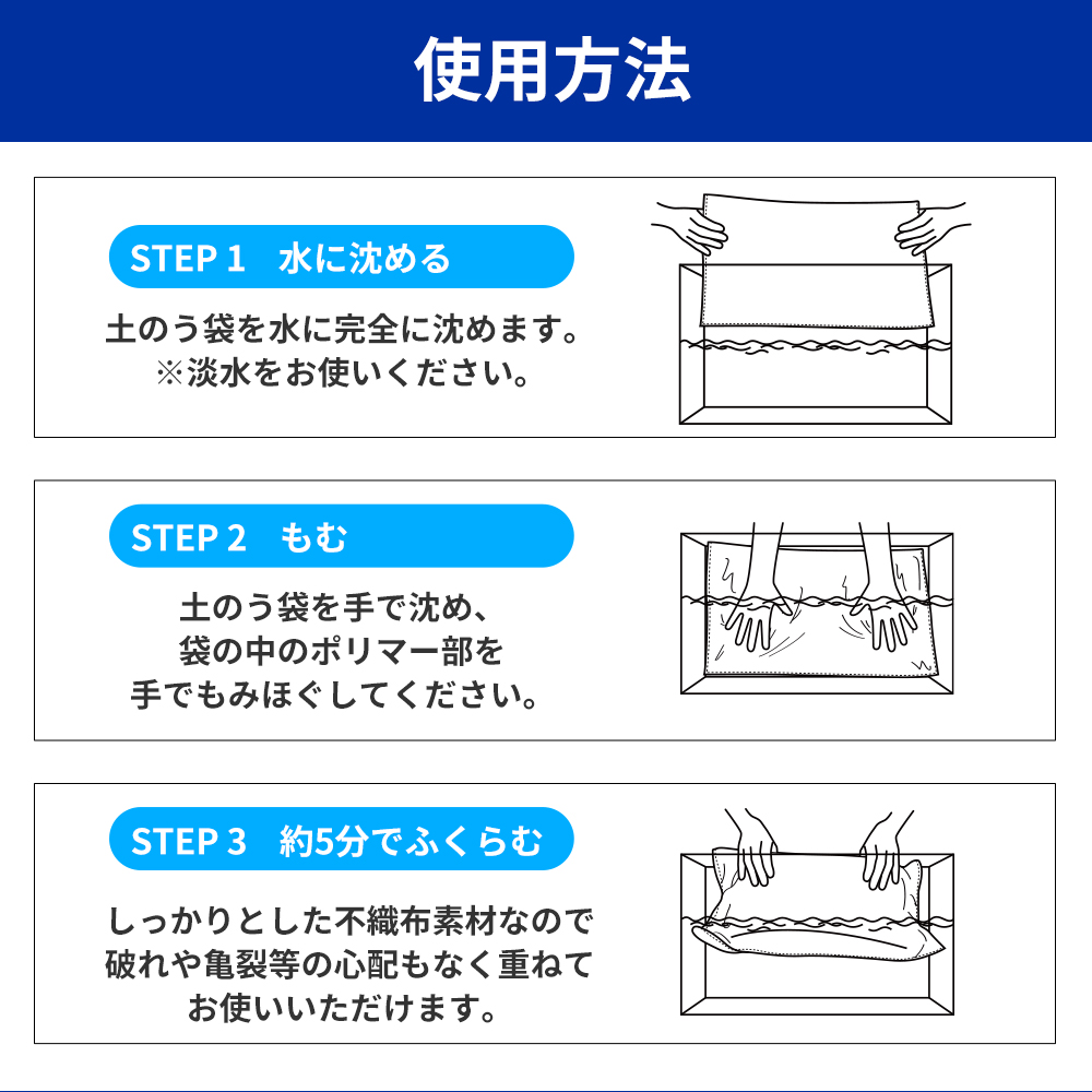 【関連ワード】 防災士監修 どのう 土嚢袋 土のう袋 どのうふくろ 高吸水性ポリマー 不織布 簡易どのう 簡易土のう 吸水土嚢 土砂不要 水だけOK 吸水 膨らむ すぐ使える インスタント 使い切り 避難 梅雨 雨 氾濫 ゲリラ豪雨 豪雨 土砂 河川 川沿い 緊急時 決壊時 災害対策 水害対策 防災用品 床下浸水 浸水防止 水止め 家屋 車庫 店舗 工事現場 汚水逆流防止 排水溝 排水管
