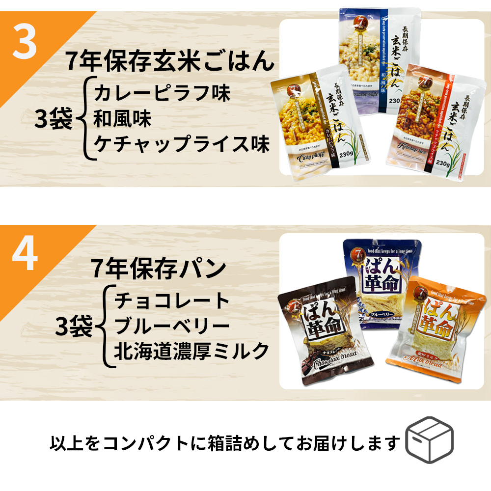 災害にあった際の非常食として長期保存や備蓄ができるご飯や食料食品のセットです。地震対策やサバイバル用としておすすめします。 保存食は進化し、今では幅広いニーズに応えられるようになっています。災害時にも普段食べ慣れた美味しい食事を摂ることができます。 保存食といえばなにを思い浮かべるでしょうか。乾パンや魚の缶詰、レトルトカレーやインスタントラーメンなどではないでしょうか? 今の保存食は、柔らかなごはんやパン、スープやハンバーグなど多種多様な種類、味が取り揃えられており、幅広いニーズに応えられるようになっていて、災害時にも食べ慣れた美味しい食事を摂ることができます。 アルファ米の『アルファ』とは、お米に含まれる「デンプンの状態」を示しています。お米は70~80%がデンプンでできています。生デンプン(生米)は、そのまま食べてもまずく、消化しにくいため栄養になりにくいのですが、水を含ませ熱を加えると、美味しくて、しかも消化しやすいデンプンに変わります。アルファ化したご飯は水分を除く(乾燥)と、生デンプンへ戻らず「アルファ化デンプン」の状態を保ち続けます。そして、このアルファ米にお湯や水を加えると、煮炊きせずとも、軟らかく美味しいご飯ができ上る、という訳です。 アルファ米は宇宙食や南極探検隊などでも使われている「インスタントごはん」とも言えるものです。 アルファ米にはさまざまな種類があり、白飯・白粥などから松茸・パエリア風・えびピラフなどさまざまな味があります。 アレルギー要素フリーなものや肉や魚、卵などが入っていないものなどもあります。 わたしはごはんではなくパン派。そういった方は「パンの缶詰」です。 普段食べているようなやわらかいパンをそのまま缶詰にしました。カンパンより食べやすく、ふんわりとした食感が特徴です。パンの缶詰はいつでも柔らかく、しっとりとした味わいです。喉が渇かないように甘みを抑えてあり、脱酵素剤や防腐剤なども使っていません。 チョコレート&ストロベリーやココア、黒まめなど味も多様で、エッグフリーなどアレルギーに対応したものもあり、安心して食べられます。 常温でもそのまま美味しいスープやお湯を入れるだけでできたてのスープになるフリーズドライスープなどを用意しておけば、 いつでも、どんなときでも本格スープを簡単に味わうことができ、栄養と水分を同時に摂取、心も身体も温めることができます。 100kcal以下、食塩相当量1g以下!しかも化学調味料無添加のものなど、健康が気になるかたでも安心して飲むことができます。 ハンバーグやさばの味噌煮、牛丼、肉じゃがまで日常のおかずも保存食に!!冷凍の必要がなく、常温で3~5年間保存ができ、そのままでも美味しく食べられます。キャンプなどのレジャー用など日常でも味わうことができます。 甘いものはこころを和ませてくれ、手軽にエネルギー補給が可能です。えいようかんやクッキー、ケーキの缶詰などがあります。スティックなどもあります。アレルゲンフリーのものもあります。 保存食には、アレルギーの原因となるアレルゲンフリーのものも数多く用意されています。また、組み合わせ次第ではベジタリアンの方や、子どもや年配の方にも満足できる保存食を用意することができます。 保存食は冷たくて寂しいイメージがありますが、温めることで、何倍にも美味しくなります。少量の水さえあれば、いつでも食事を暖められます。ご飯やおかずはもちろん、パンの缶詰もアツアツで美味しく食べることができます。 いざというときの備蓄だけではなく、キャンプやアウトドアのお供に、またプレゼントとしても!! 災害から支援物資が届くまでの最低3日分~7日分の水と食料を備えて置くことが推奨されています。 災害時には水や食料が店頭から売り切れるなど、物流が止まることも想定されるため、自分や家族を含めた用意をしておきましょう。