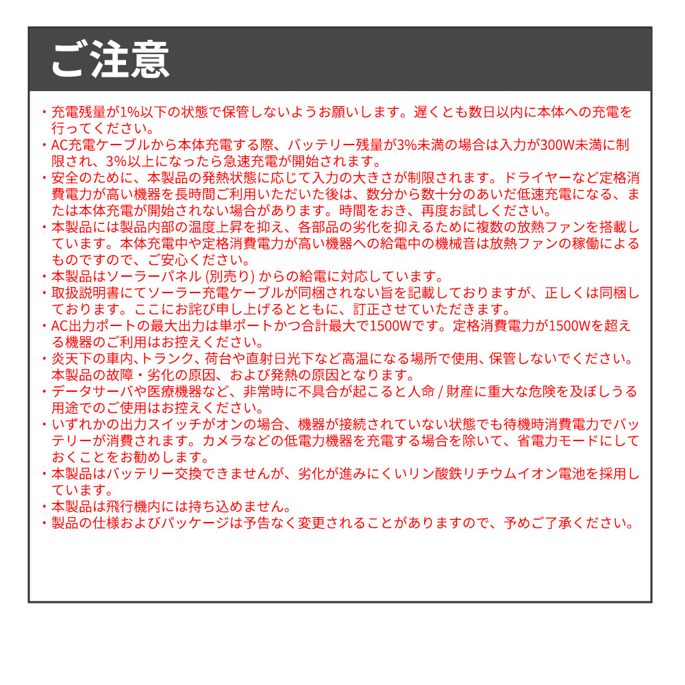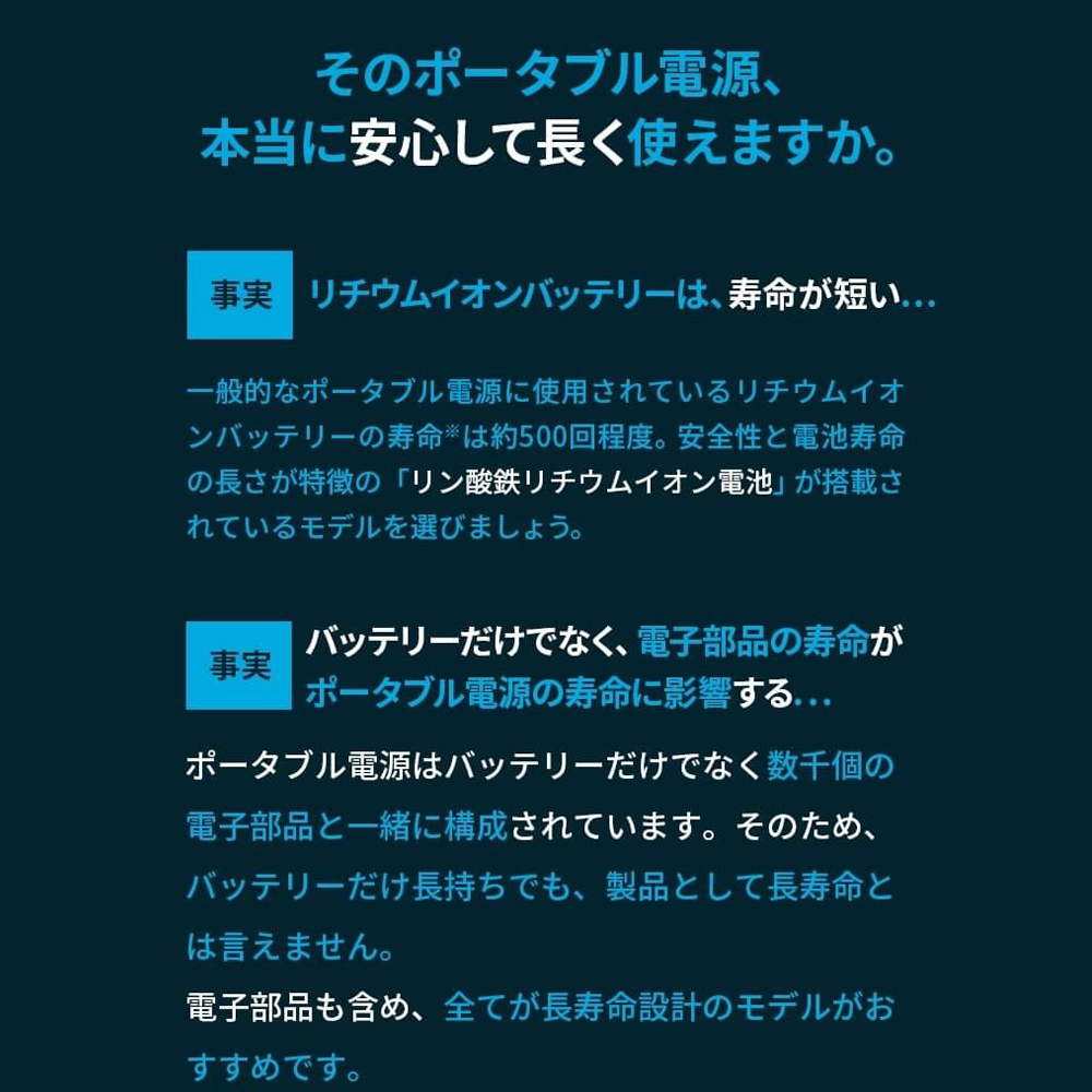 モバイルバッテリー・蓄電池 の重要性 災害時に停電になると、夜間には照明が必要になり、情報としてのテレビは見られなくなり、スマートフォンはバッテリーがなくなっていきます。また停電により乾電池を求める人が多くなり、電池が品切れになることが予想されます。停電の復旧には数時間から一週間以上かかる場合もあります。電池が使えなくなる前に、バッテリー・電池などの備えることが大切です。 モバイルバッテリー 家族の安否を確認したり、最新ニュースをチェックしたり、災害情報をいちはやく正確に確認することができるスマートフォンは災害時に重要な情報機器として活躍しています。 2018年の北海道地震の大規模停電が起こった際にも、基地局の非常電源に携帯のネットは数時間維持され、情報を得ることができました。スマートフォンのバッテリーを維持することは災害時の重要なポイントとなっています。 蓄電池 大型の蓄電池は、扇風機やちょっとした家電なども使用できる災害時に頼りになる大容量です。360whのものならノートパソコンなら5時間、扇風機などは約6時間使用が可能です。 折りたたみ式ソーラーチャージャー 折りたたみ式のソーラーモバイルチャージャーを使用することで、太陽の光さえあれば、電源を確保することが可能です。 ソーラーチャージャーからは直接スマートフォンやパソコンなどにも充電できます。 夏に災害が起きたときでも、扇風機などが使用できます。