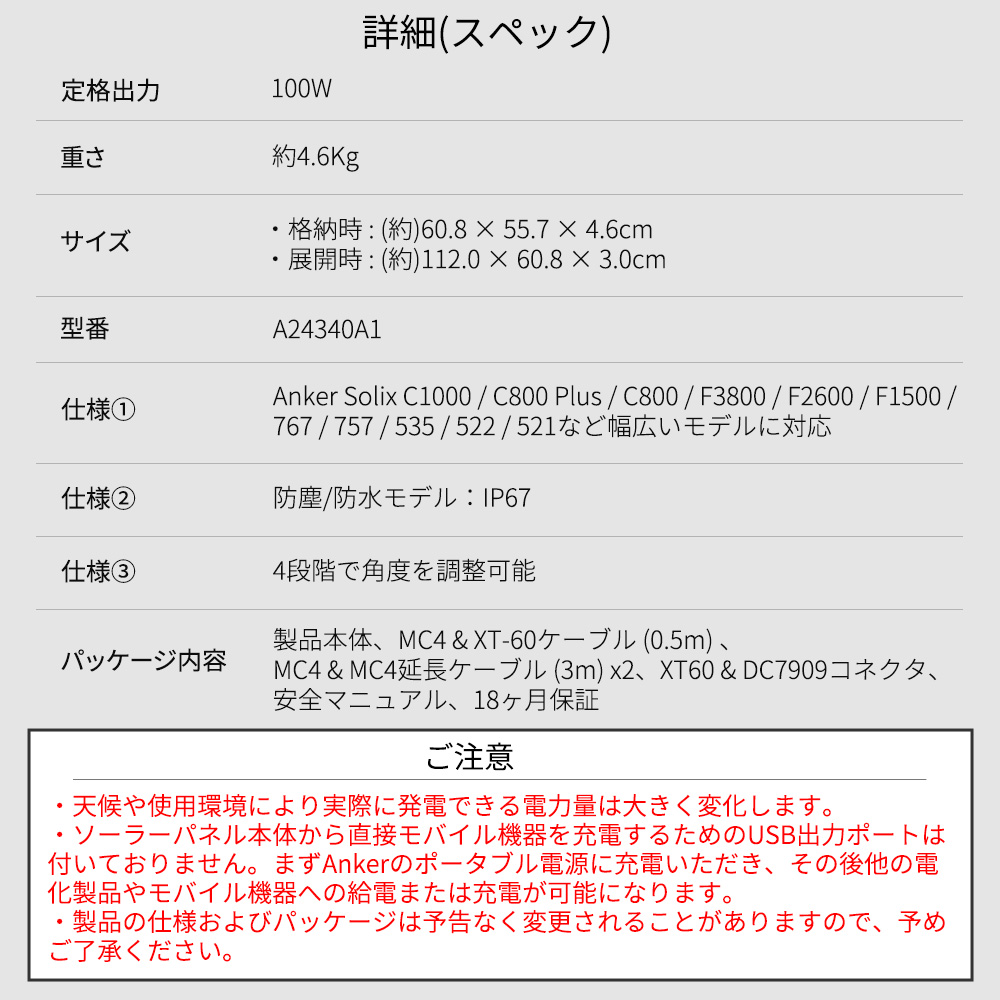 4. ポータブル電源535 512wh+ソーラーパネル Solix PS100 Portable Solar Panel 100Wセット Anker 大容量 長寿命 蓄電器 非常用 防災 キャンプ