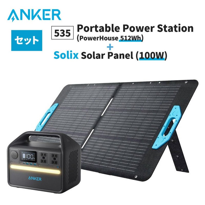18ヵ月保証 充電のリーディングブランド 高出力 高耐久 ポータブル電源535 512wh+ソーラーパネル Solix PS100 Portable Solar Panel 100Wセット Anker 大容量 長寿命 蓄電器 非常用 防災 キャンプ