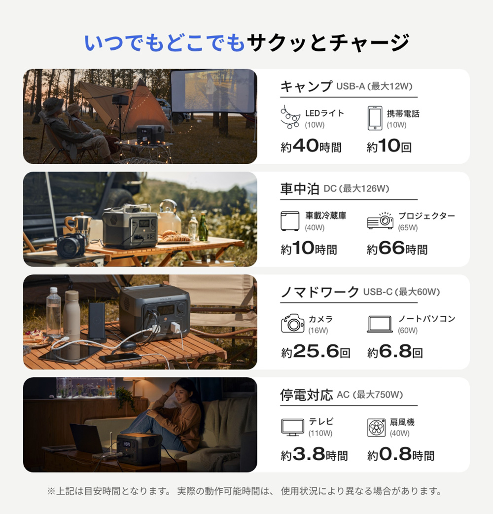 モバイルバッテリー・蓄電池 の重要性 災害時に停電になると、夜間には照明が必要になり、情報としてのテレビは見られなくなり、スマートフォンはバッテリーがなくなっていきます。また停電により乾電池を求める人が多くなり、電池が品切れになることが予想されます。停電の復旧には数時間から一週間以上かかる場合もあります。電池が使えなくなる前に、バッテリー・電池などの備えることが大切です。 モバイルバッテリー 家族の安否を確認したり、最新ニュースをチェックしたり、災害情報をいちはやく正確に確認することができるスマートフォンは災害時に重要な情報機器として活躍しています。 2018年の北海道地震の大規模停電が起こった際にも、基地局の非常電源に携帯のネットは数時間維持され、情報を得ることができました。スマートフォンのバッテリーを維持することは災害時の重要なポイントとなっています。 蓄電池 大型の蓄電池は、扇風機やちょっとした家電なども使用できる災害時に頼りになる大容量です。360whのものならノートパソコンなら5時間、扇風機などは約6時間使用が可能です。 折りたたみ式ソーラーチャージャー 折りたたみ式のソーラーモバイルチャージャーを使用することで、太陽の光さえあれば、電源を確保することが可能です。 ソーラーチャージャーからは直接スマートフォンやパソコンなどにも充電できます。 夏に災害が起きたときでも、扇風機などが使用できます。