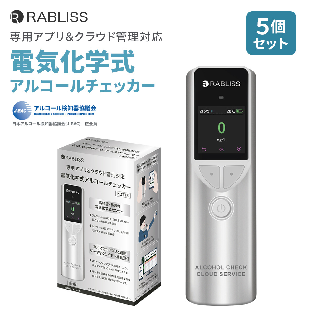 アルコール検知器協議会 認定機器 DOT(米国運輸省)認定品 クラウド アプリ連携 アルコールチェッカー アルコール検知器 アラーム表示 飲酒検査 高精度 簡単充電 長寿命 電気化学式センサー 飲酒運転防止 簡単測定 コンパクト 軽量 酒気帯び運転 飲酒チェッカー アルコールチェック セルフチェック 飲酒運転防止 携帯用 呼気検査 1年半 10,000回測定可能 小林薬品 RABLISS
