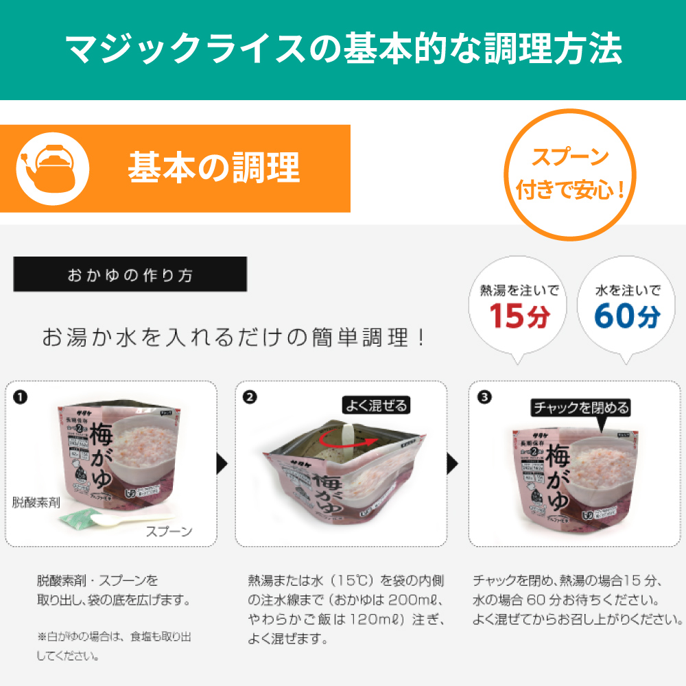 備えて安心!水でもお湯でも調理できる おかゆ・やわらかご飯 スプーン付き 原材料にアレルギー物質(特定原材料等)28品目不使用