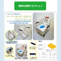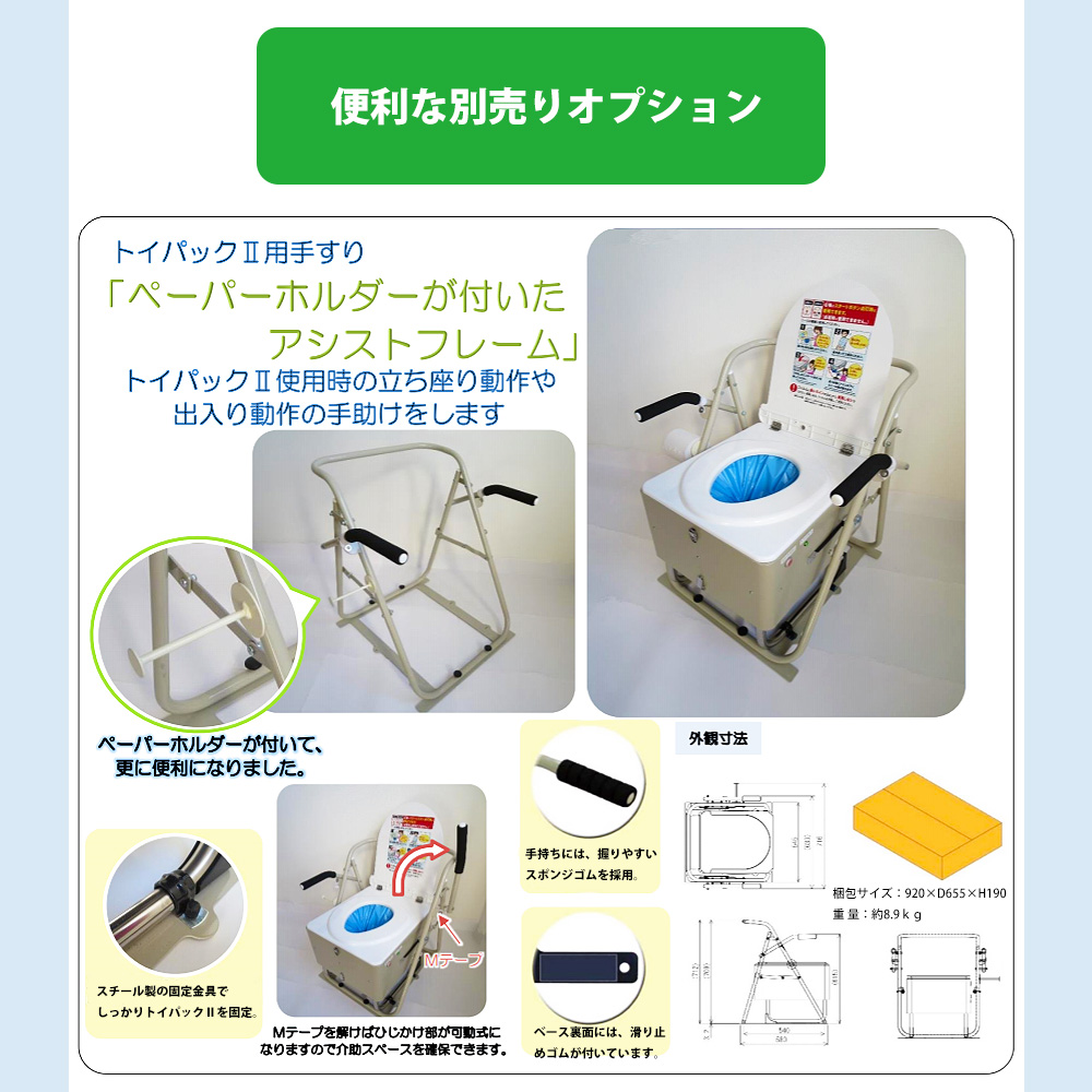 一回ずつ凝固剤で固め、フィルムで包むから、臭わない・衛生的・きれいを実現しました。別売りオプションでペーパーホルダーが付いたアシストフレーム、雨音で女性をサポートするサポ音があります。女性や手すりが必要な方にもお勧めです。フィルム・凝固剤×600回分セットのみも販売しています。