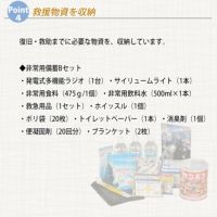 ◆非常用備蓄Bセット ・発電式多機能ラジオ(1台)・サイリュームライト(1本)・非常用食料(475g/1個) ・非常用飲料水(500ml×1本)・救急用品(1セット)・ホイッスル(1個) ・ポリ袋(20枚)・トイレットペーパー(1本)・消臭剤(1個)・便凝固剤(20回分) ・ブランケット(2枚)