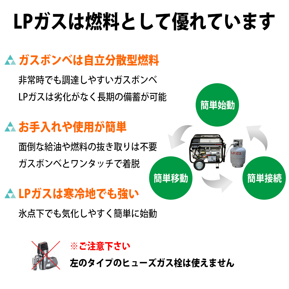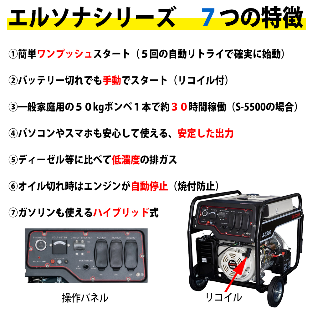 大家族一軒分の電力をカバー!非常時の電源確保 発電機 ハイブリッド式 (LPガス&ガソリン) 可搬型 ELSONA S-5500