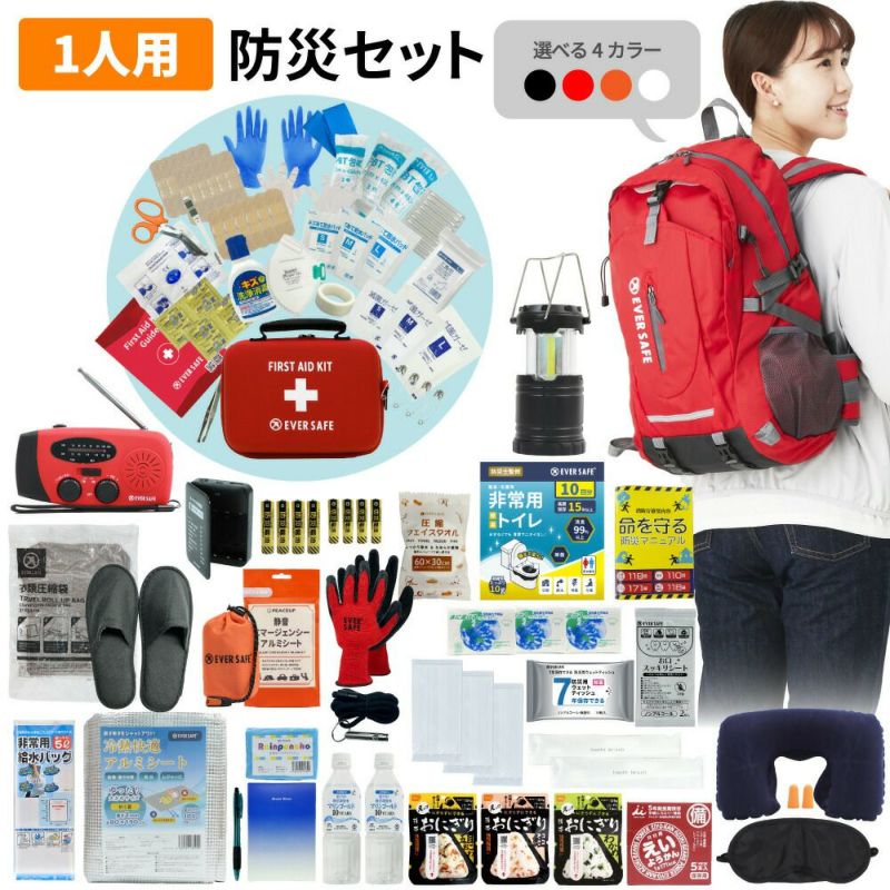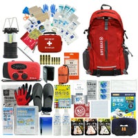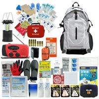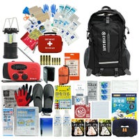 ファーストエイドケース (Lサイズ)×1 / 液晶体温計×1 / N95防護マスク×1 / キズ洗浄消毒×1 / 絆創膏 (Mサイズ)×12 / 絆創膏 (Lサイズ)×6 / キズあて防水パッド (S/M/L)×各1 / 滅菌ガーゼ (S/M/L)×各1 / アルコール消毒綿×4 / ハサミ×1 / ピンセット×1 /包帯 (2号/3号/4号)×各1 / 不織布三角巾×1 / 綿棒 (個包装)×10 / ニトリル手袋 (個装パッケージ入)×1 / ポリエチレン手袋 (密封個包装)×2 / 不織布テープ×1 / 安全ピン×4 / 熱可塑性エラストマー 止血帯 (ゴム) ×1 / 人工呼吸マウスピース×1 / ファーストエイドキットガイド×1