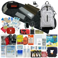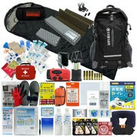 ファーストエイドケース (Lサイズ)×1 / 液晶体温計×1 / N95防護マスク×1 / キズ洗浄消毒×1 / 絆創膏 (Mサイズ)×12 / 絆創膏 (Lサイズ)×6 / キズあて防水パッド (S/M/L)×各1 / 滅菌ガーゼ (S/M/L)×各1 / アルコール消毒綿×4 / ハサミ×1 / ピンセット×1 /包帯 (2号/3号/4号)×各1 / 不織布三角巾×1 / 綿棒 (個包装)×10 / ニトリル手袋 (個装パッケージ入)×1 / ポリエチレン手袋 (密封個包装)×2 / 不織布テープ×1 / 安全ピン×4 / 熱可塑性エラストマー 止血帯 (ゴム) ×1 / 人工呼吸マウスピース×1 / ファーストエイドキットガイド×1