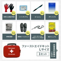 ファーストエイドケース (Lサイズ)×1 / 液晶体温計×1 / N95防護マスク×1 / キズ洗浄消毒×1 / 絆創膏 (Mサイズ)×12 / 絆創膏 (Lサイズ)×6 / キズあて防水パッド (S/M/L)×各1 / 滅菌ガーゼ (S/M/L)×各1 / アルコール消毒綿×4 / ハサミ×1 / ピンセット×1 /包帯 (2号/3号/4号)×各1 / 不織布三角巾×1 / 綿棒 (個包装)×10 / ニトリル手袋 (個装パッケージ入)×1 / ポリエチレン手袋 (密封個包装)×2 / 不織布テープ×1 / 安全ピン×4 / 熱可塑性エラストマー 止血帯 (ゴム) ×1 / 人工呼吸マウスピース×1 / ファーストエイドキットガイド×1