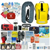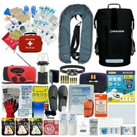 ファーストエイドケース (Lサイズ)×1 / 液晶体温計×1 / N95防護マスク×1 / キズ洗浄消毒×1 / 絆創膏 (Mサイズ)×12 / 絆創膏 (Lサイズ)×6 / キズあて防水パッド (S/M/L)×各1 / 滅菌ガーゼ (S/M/L)×各1 / アルコール消毒綿×4 / ハサミ×1 / ピンセット×1 /包帯 (2号/3号/4号)×各1 / 不織布三角巾×1 / 綿棒 (個包装)×10 / ニトリル手袋 (個装パッケージ入)×1 / ポリエチレン手袋 (密封個包装)×2 / 不織布テープ×1 / 安全ピン×4 / 熱可塑性エラストマー 止血帯 (ゴム) ×1 / 人工呼吸マウスピース×1 / ファーストエイドキットガイド×1