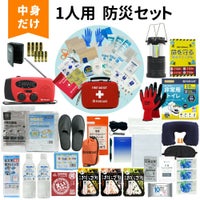 ファーストエイドケース (Lサイズ)×1 / 液晶体温計×1 / N95防護マスク×1 / キズ洗浄消毒×1 / 絆創膏 (Mサイズ)×12 / 絆創膏 (Lサイズ)×6 / キズあて防水パッド (S/M/L)×各1 / 滅菌ガーゼ (S/M/L)×各1 / アルコール消毒綿×4 / ハサミ×1 / ピンセット×1 /包帯 (2号/3号/4号)×各1 / 不織布三角巾×1 / 綿棒 (個包装)×10 / ニトリル手袋 (個装パッケージ入)×1 / ポリエチレン手袋 (密封個包装)×2 / 不織布テープ×1 / 安全ピン×4 / 熱可塑性エラストマー 止血帯 (ゴム) ×1 / 人工呼吸マウスピース×1 / ファーストエイドキットガイド×1