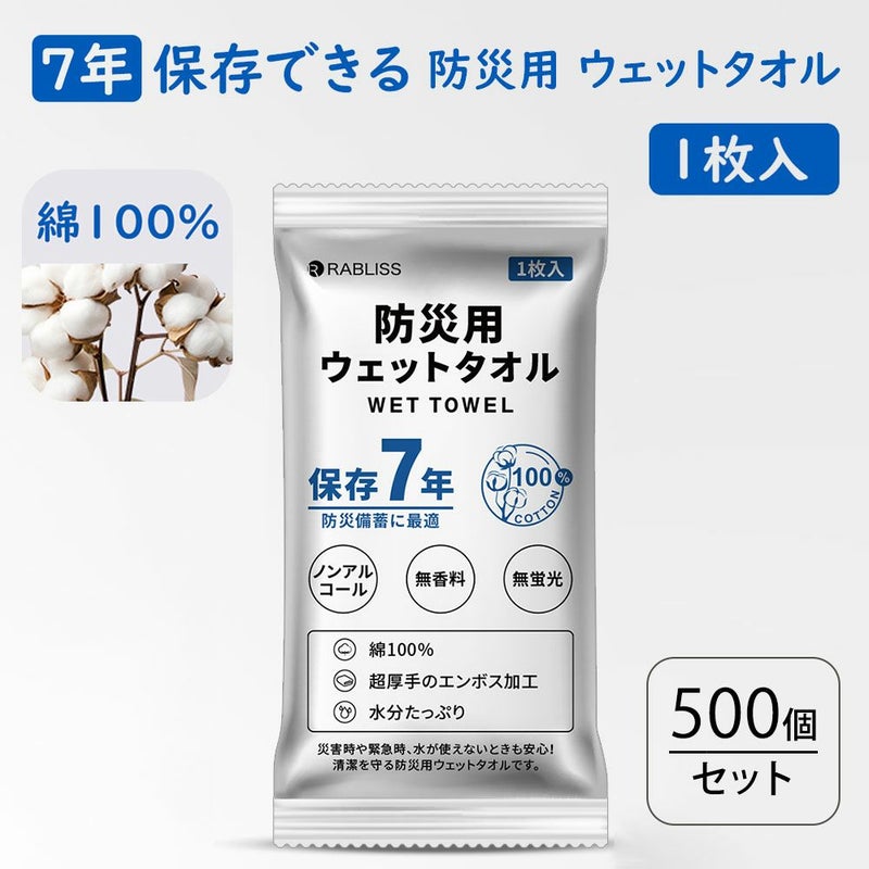 3. 防災グッズ 7年保存 防災用ウェットタオル 1枚入 500個セット/箱 ウェットタオル 衛生用品 綿100% ノンアルコール 長期保存 厚手 清潔 断水 KO387