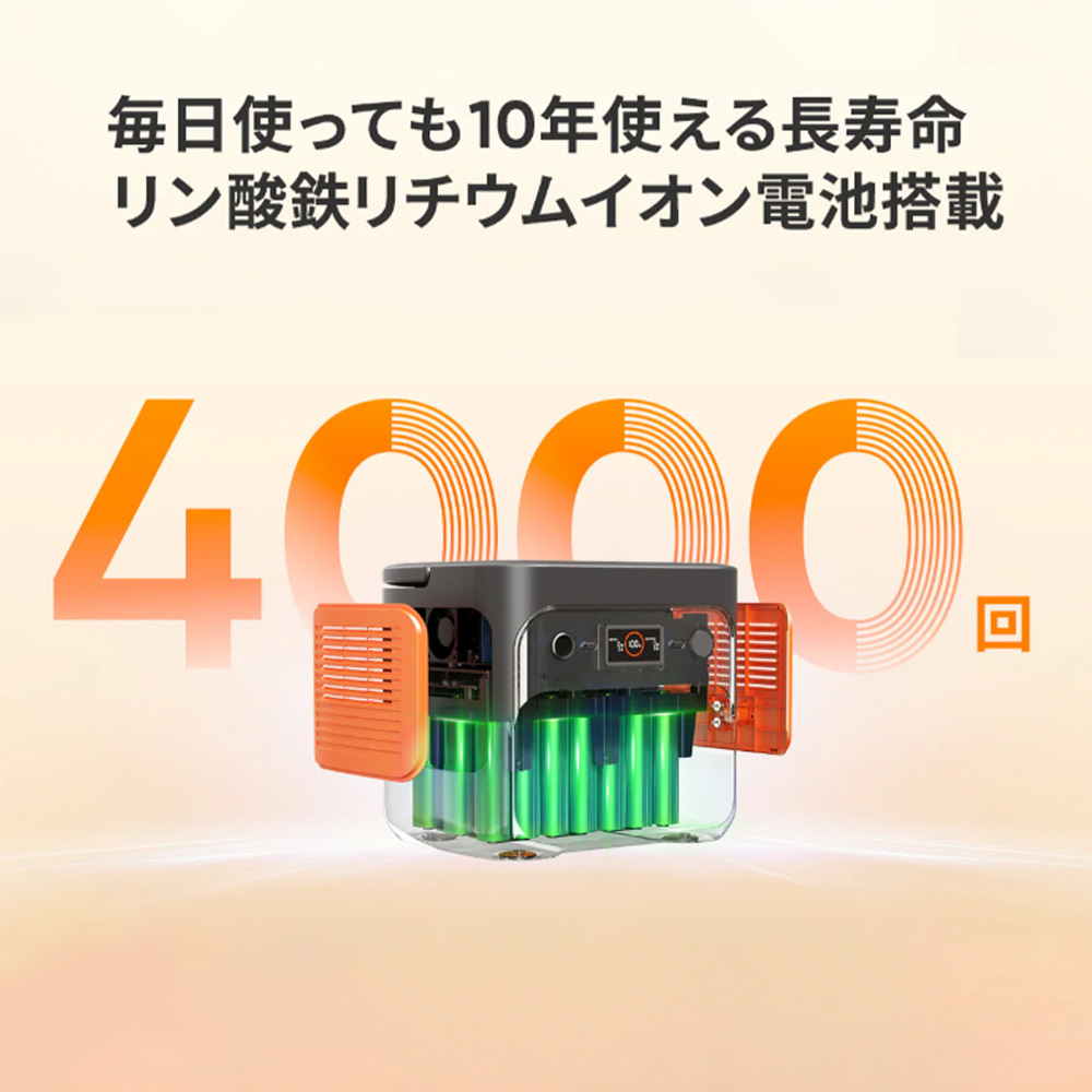 長寿命のリン酸鉄リチウムイオン電池を搭載。約4000 回の充放電サイクルにより毎日使っても10年間使えます。