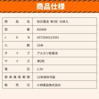 【商品仕様(1箱あたり)】 ■商品名:防災電池 単2形 10本入 型番:KO408 タイプ/サイズ/電圧:アルカリ乾電池/単2形/1.5V パッケージサイズ:約13.0×5.2×5.2cm