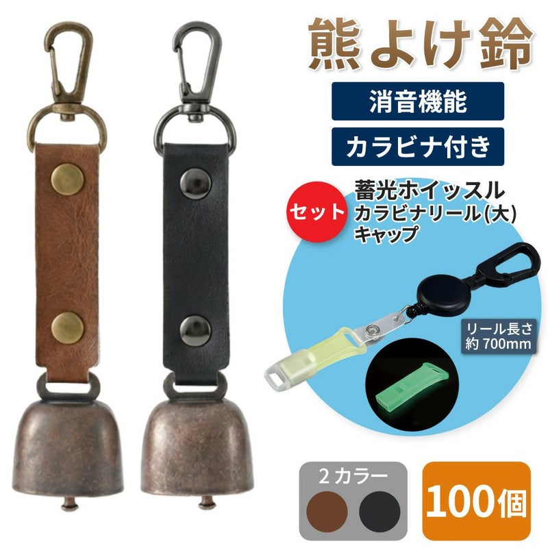 熊鈴 熊よけ鈴 カラビナ付きリール大 蓄光ホイッスル キャップ 4点セット ブラウン ブラック 100個 熊対策 消音機能付き マグネット ホイッスル リール大 キャップ まとめ買い EVERSAFE