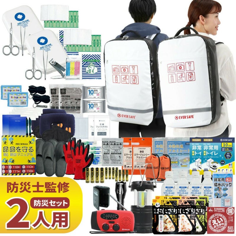 こちらの防災セットには非常用用品として簡易トイレや保存食などが揃った2人用の商品です。被災者の声を参考に防災士が詳細にチェックした内容です。Amazon等でも同じものを販売していますが価格は本サイトがお得。 保存食は進化し、今では幅広いニーズに応えられるようになっています。災害時にも普段食べ慣れた美味しい食事を摂ることができます。 保存食といえばなにを思い浮かべるでしょうか。乾パンや魚の缶詰、レトルトカレーやインスタントラーメンなどではないでしょうか? 今の保存食は、柔らかなごはんやパン、スープやハンバーグなど多種多様な種類、味が取り揃えられており、幅広いニーズに応えられるようになっていて、災害時にも食べ慣れた美味しい食事を摂ることができます。 アルファ米の『アルファ』とは、お米に含まれる「デンプンの状態」を示しています。お米は70から80%がデンプンでできています。生デンプン(生米)は、そのまま食べてもまずく、消化しにくいため栄養になりにくいのですが、水を含ませ熱を加えると、美味しくて、しかも消化しやすいデンプンに変わります。アルファ化したご飯は水分を除く(乾燥)と、生デンプンへ戻らず「アルファ化デンプン」の状態を保ち続けます。そして、このアルファ米にお湯や水を加えると、煮炊きせずとも、軟らかく美味しいご飯ができ上る、という訳です。 アルファ米は宇宙食や南極探検隊などでも使われている「インスタントごはん」とも言えるものです。 アルファ米にはさまざまな種類があり、白飯・白粥などから松茸・パエリア風・えびピラフなどさまざまな味があります。 アレルギー要素フリーなものや肉や魚、卵などが入っていないものなどもあります。 わたしはごはんではなくパン派。そういった方は「パンの缶詰」です。 普段食べているようなやわらかいパンをそのまま缶詰にしました。カンパンより食べやすく、ふんわりとした食感が特徴です。パンの缶詰はいつでも柔らかく、しっとりとした味わいです。喉が渇かないように甘みを抑えてあり、脱酵素剤や防腐剤なども使っていません。 チョコレート&ストロベリーやココア、黒まめなど味も多様で、エッグフリーなどアレルギーに対応したものもあり、安心して食べられます。 常温でもそのまま美味しいスープやお湯を入れるだけでできたてのスープになるフリーズドライスープなどを用意しておけば、 いつでも、どんなときでも本格スープを簡単に味わうことができ、栄養と水分を同時に摂取、心も身体も温めることができます。 100kcal以下、食塩相当量1g以下!しかも化学調味料無添加のものなど、健康が気になるかたでも安心して飲むことができます。 ハンバーグやさばの味噌煮、牛丼、肉じゃがまで日常のおかずも保存食に!!冷凍の必要がなく、常温で3から5年間保存ができ、そのままでも美味しく食べられます。キャンプなどのレジャー用など日常でも味わうことができます。 甘いものはこころを和ませてくれ、手軽にエネルギー補給が可能です。えいようかんやクッキー、ケーキの缶詰などがあります。スティックなどもあります。アレルゲンフリーのものもあります。 保存食には、アレルギーの原因となるアレルゲンフリーのものも数多く用意されています。また、組み合わせ次第ではベジタリアンの方や、子どもや年配の方にも満足できる保存食を用意することができます。 保存食は冷たくて寂しいイメージがありますが、温めることで、何倍にも美味しくなります。少量の水さえあれば、いつでも食事を暖められます。ご飯やおかずはもちろん、パンの缶詰もアツアツで美味しく食べることができます。 いざというときの備蓄だけではなく、キャンプやアウトドアのお供に、またプレゼントとしても!! 災害から支援物資が届くまでの最低3日分から7日分の水と食料を備えて置くことが推奨されています。 災害時には水や食料が店頭から売り切れるなど、物流が止まることも想定されるため、自分や家族を含めた用意をしておきましょう。