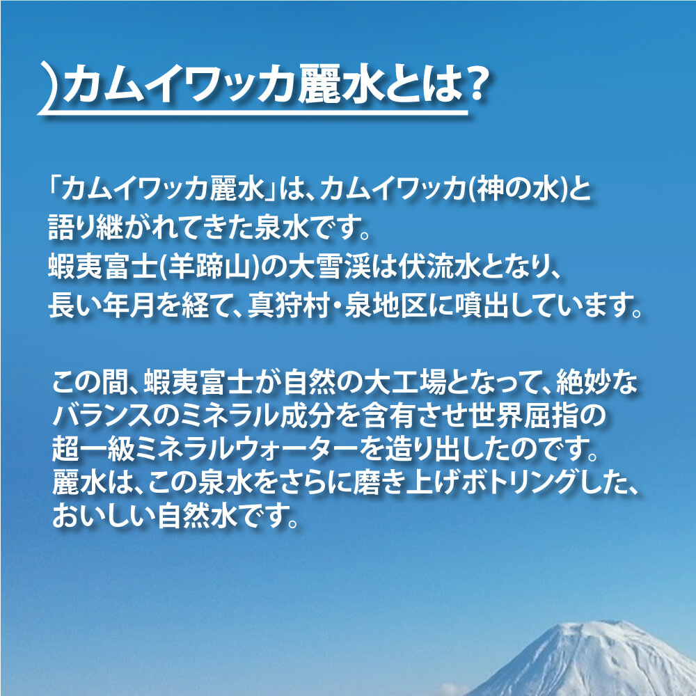 蝦夷富士(羊蹄山)の大雪渓は、伏流水となり長い年月を経て、真狩村・泉地区に噴出しています。 この間、蝦夷富士が自然の大工場となって、絶妙なバランスのミネラル成分を含有させ世界屈指の超一級ミネラルウォーターを造り出したのです。 麗水は、この泉水をさらに磨き上げボトリングした、永遠の生命のおいしい自然水です。