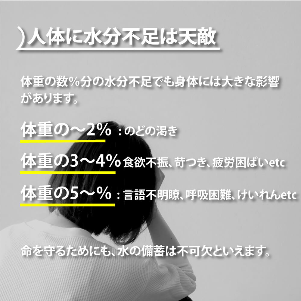平常と異なる環境では極度のストレスにより体調を崩す可能性が高くなります。生命を維持するためには飲料水の備蓄は必須です。1日でも水を摂取できないと生命の危険性があります。またエコノミークラス症候群を発症してしまうこともあります。