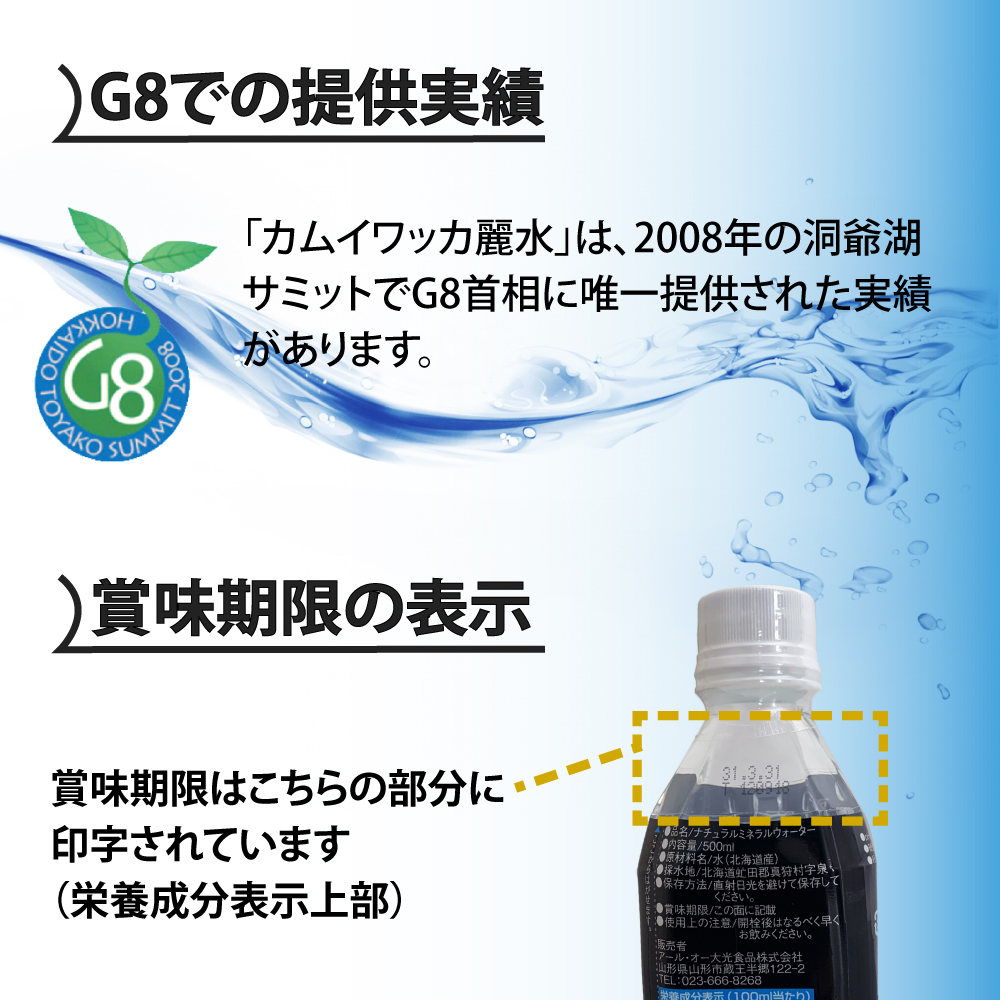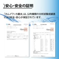 カムイワッカ麗水は天然水を採水し紫外線殺菌処理、加熱処理、再度冷却をします。その水を高温スチームにより洗瓶されたペットボトルに充填後、キャッパーにより封印。賞味期限が印字され、目視外観検査を経てラベル装着、シュリンクによりラッピング。その後、段ボール包装されます。類似品は経過年数の確認もなく、公的機関の水質分析試験成績書もないまま、保存水として販売されていることも少なくありません。カムイワッカ麗水は2008年の洞爺湖サミットでG8首相に唯一提供された安心安全なミネラルウォーターです。