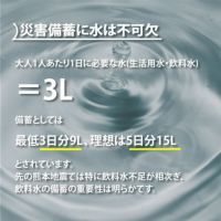 2L保存水もリュックに入る大きさですが基本的には持ち運ばず備蓄に適しています。500ml保存水と比べコストパフォマンスが高く避難所や自治体・企業の大量備蓄にお薦めです。また自宅で被災した場合に避難所へ移動できず、ライフラインも寸断されることも考えられますので各家庭でも備蓄しておきましょう。